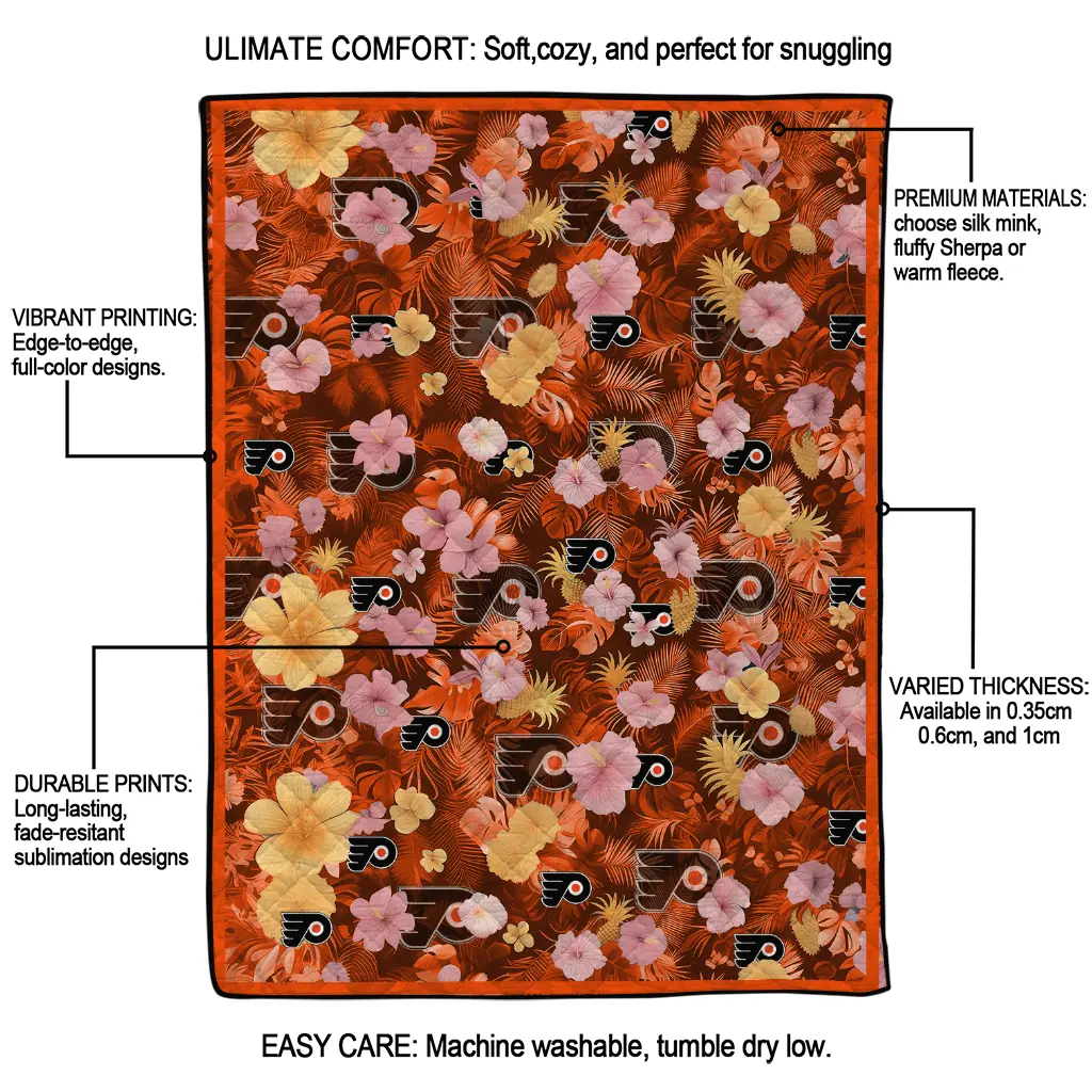 Wrap yourself in warmth and pride with the Philadelphia Flyers Hibiscus Foliage Orange Quilt Blanket from the Philadelphia Flyers Blankets collection at Yes That Blanket. Made from 100% premium quilting-weight polyester blended with a touch of microfiber, this quilt offers a smooth, soft finish you’ll love. Choose between two quilting styles—Stipple or Diagonal—and enjoy the comfort of a cotton-filled layer inside that adds extra coziness for every season. The border is available in classic black or white, giving your design a clean, timeless edge.