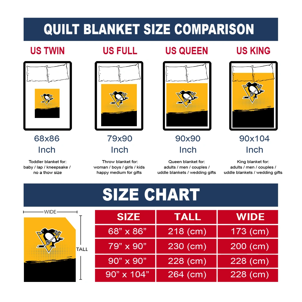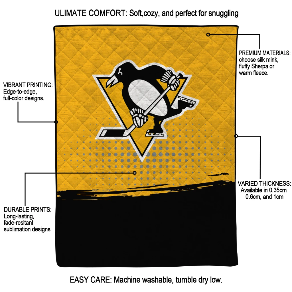 Wrap yourself in warmth and pride with the Pittsburgh Penguins Dot Illusion Yellow Quilt Blanket from the Pittsburgh Penguins Blankets collection at Yes That Blanket. Made from 100% premium quilting-weight polyester blended with a touch of microfiber, this quilt offers a smooth, soft finish you’ll love. Choose between two quilting styles—Stipple or Diagonal—and enjoy the comfort of a cotton-filled layer inside that adds extra coziness for every season. The border is available in classic black or white, giving your design a clean, timeless edge.