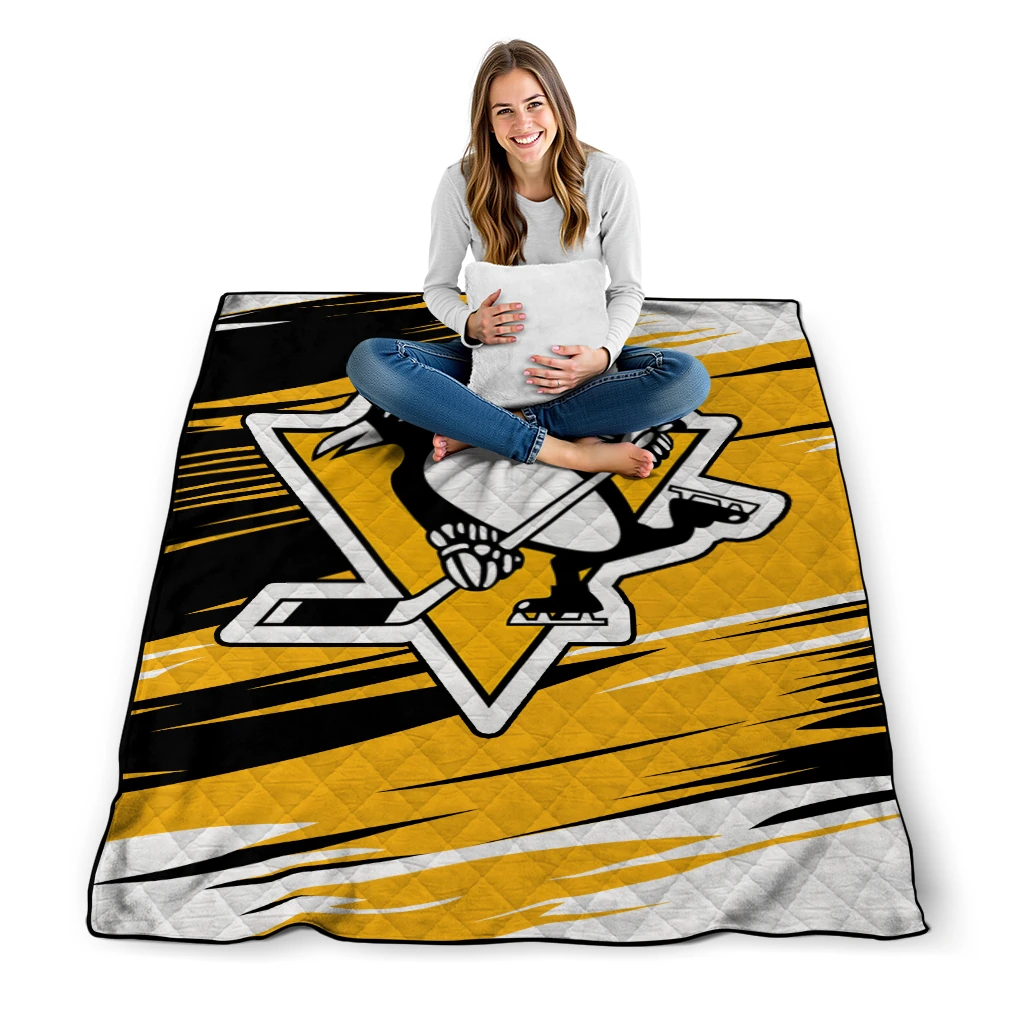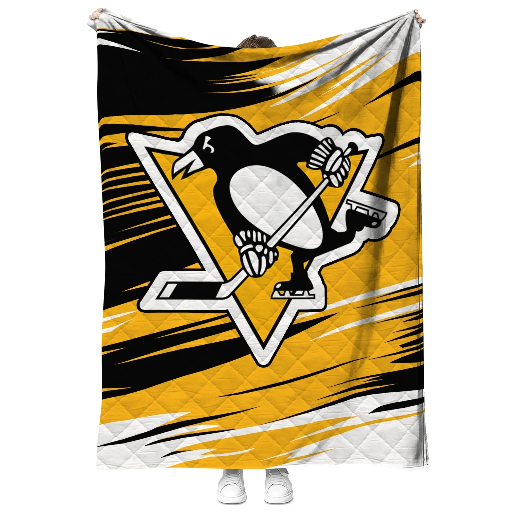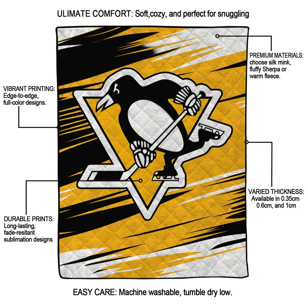 Wrap yourself in warmth and pride with the Pittsburgh Penguins Wild Lines Yellow White Quilt Blanket from the Pittsburgh Penguins Blankets collection at Yes That Blanket. Made from 100% premium quilting-weight polyester blended with a touch of microfiber, this quilt offers a smooth, soft finish you’ll love. Choose between two quilting styles—Stipple or Diagonal—and enjoy the comfort of a cotton-filled layer inside that adds extra coziness for every season. The border is available in classic black or white, giving your design a clean, timeless edge.