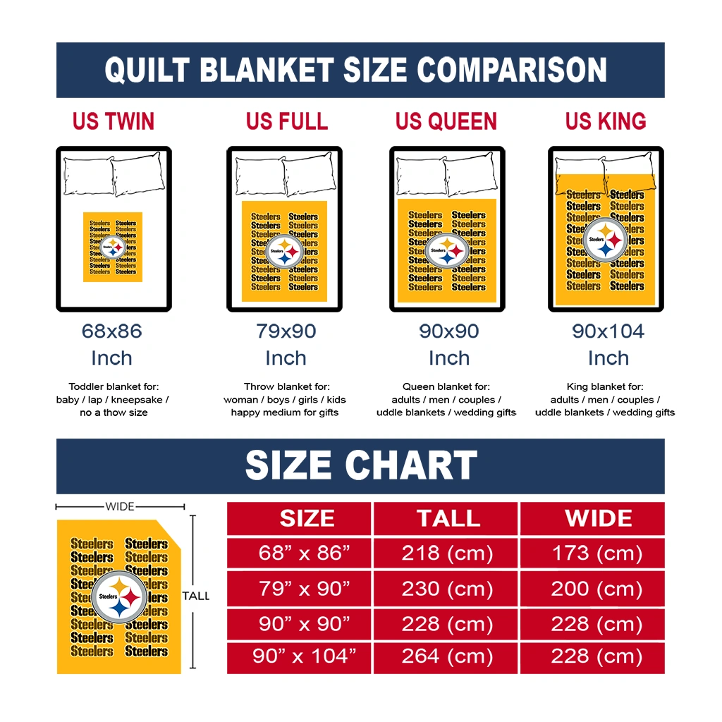 Wrap yourself in warmth and pride with the Pittsburgh Steelers Bold Red Gold Quilt Blanket from the Pittsburgh Steelers Blankets collection at Yes That Blanket. Made from 100% premium quilting-weight polyester blended with a touch of microfiber, this quilt offers a smooth, soft finish you’ll love. Choose between two quilting styles—Stipple or Diagonal—and enjoy the comfort of a cotton-filled layer inside that adds extra coziness for every season. The border is available in classic black or white, giving your design a clean, timeless edge.