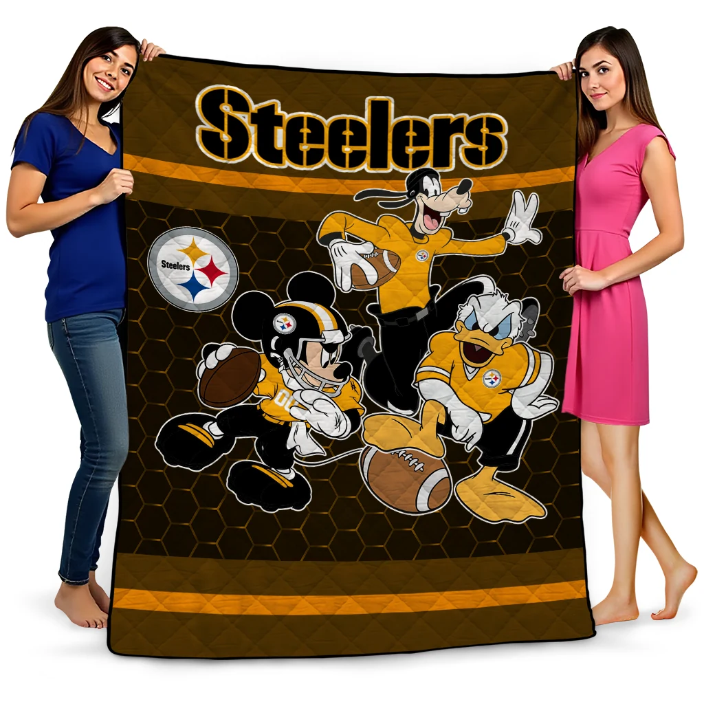 Wrap yourself in warmth and pride with the Pittsburgh Steelers Disney Football Gold Quilt Blanket from the Pittsburgh Steelers Blankets collection at Yes That Blanket. Made from 100% premium quilting-weight polyester blended with a touch of microfiber, this quilt offers a smooth, soft finish you’ll love. Choose between two quilting styles—Stipple or Diagonal—and enjoy the comfort of a cotton-filled layer inside that adds extra coziness for every season. The border is available in classic black or white, giving your design a clean, timeless edge.