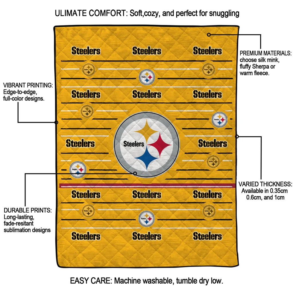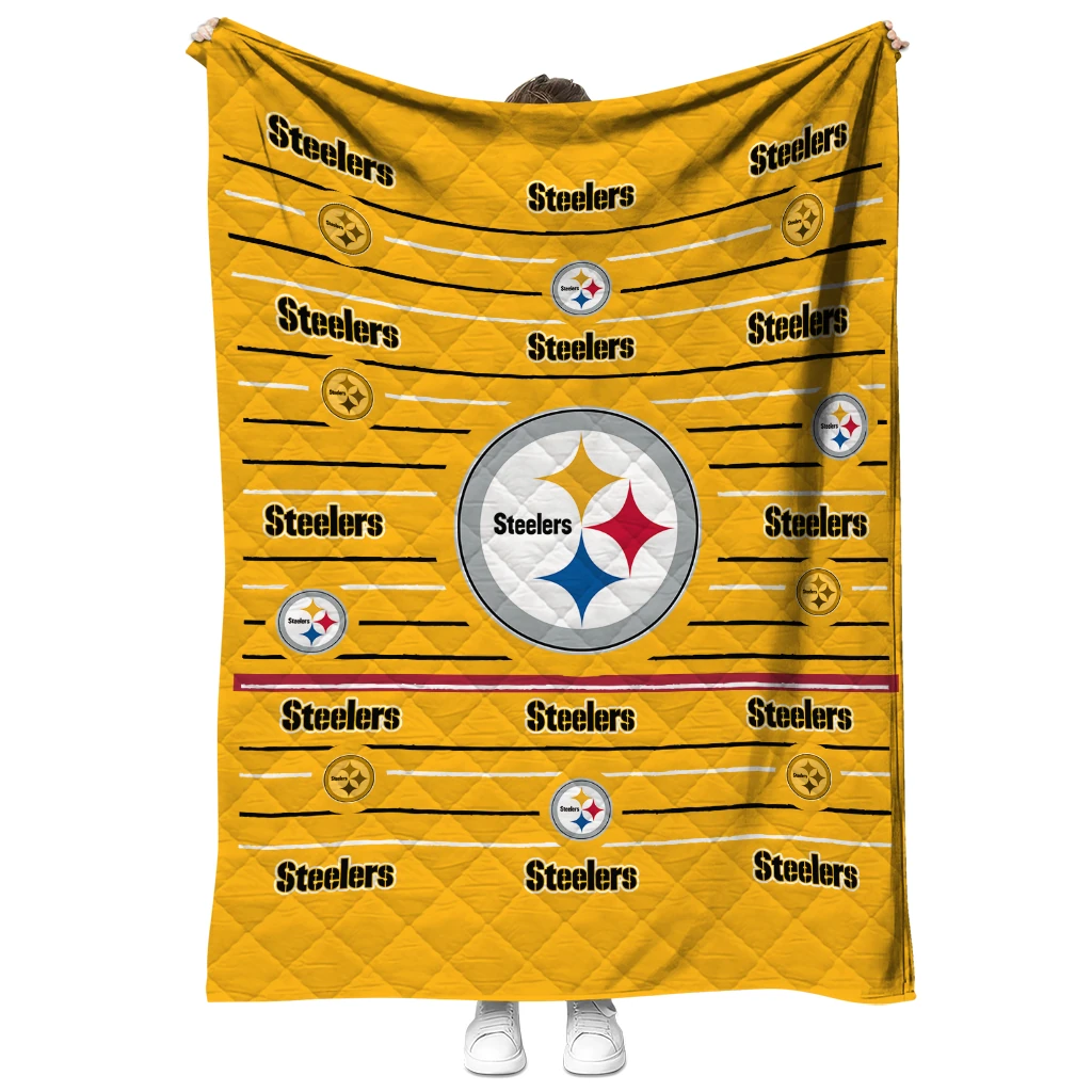 Wrap yourself in warmth and pride with the Pittsburgh Steelers Handdrawn Stripes Gold Quilt Blanket from the Pittsburgh Steelers Blankets collection at Yes That Blanket. Made from 100% premium quilting-weight polyester blended with a touch of microfiber, this quilt offers a smooth, soft finish you’ll love. Choose between two quilting styles—Stipple or Diagonal—and enjoy the comfort of a cotton-filled layer inside that adds extra coziness for every season. The border is available in classic black or white, giving your design a clean, timeless edge.
