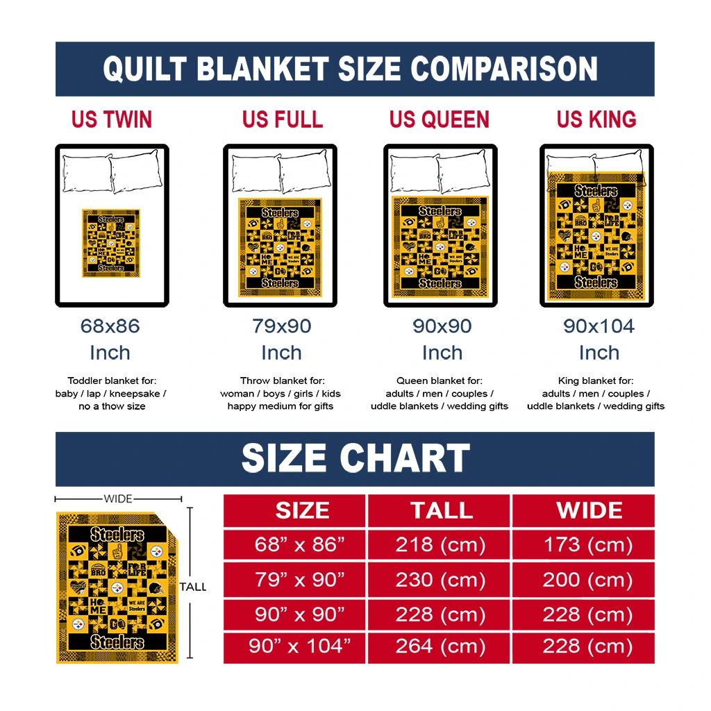 Wrap yourself in warmth and pride with the Pittsburgh Steelers Helmet Heart Gold Quilt Blanket from the Pittsburgh Steelers Blankets collection at Yes That Blanket. Made from 100% premium quilting-weight polyester blended with a touch of microfiber, this quilt offers a smooth, soft finish you’ll love. Choose between two quilting styles—Stipple or Diagonal—and enjoy the comfort of a cotton-filled layer inside that adds extra coziness for every season. The border is available in classic black or white, giving your design a clean, timeless edge.