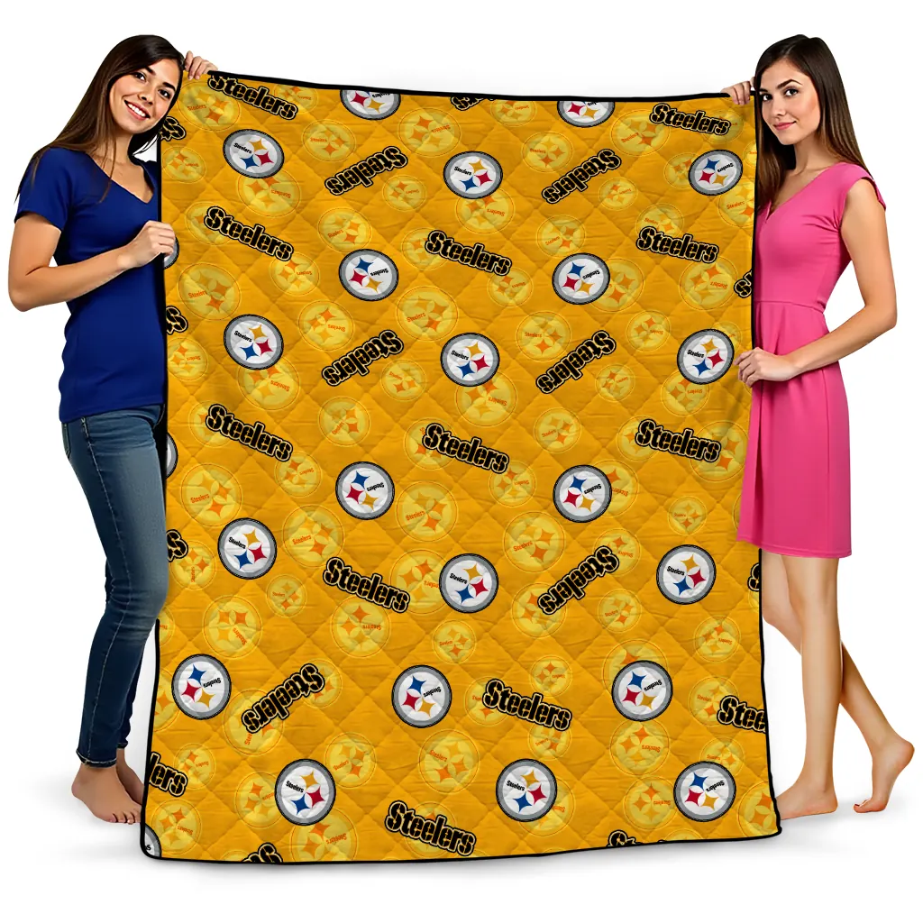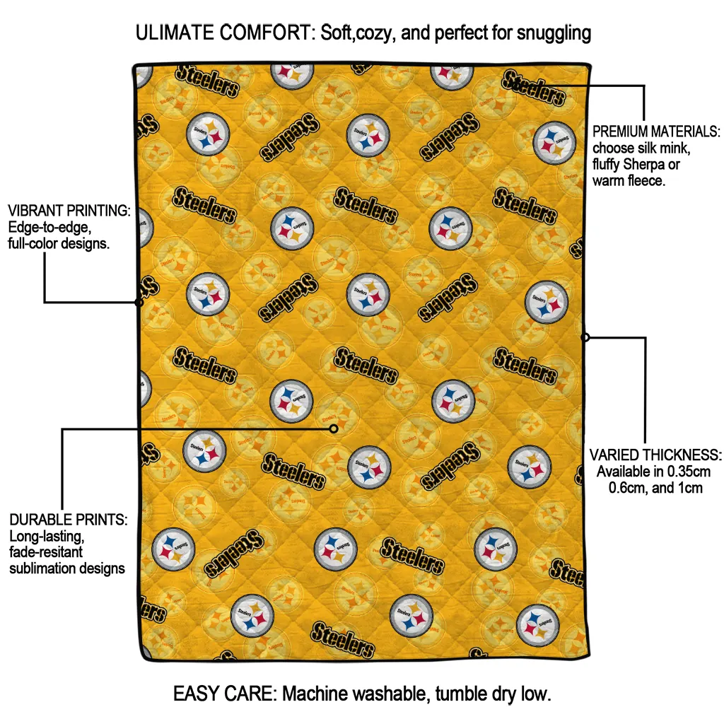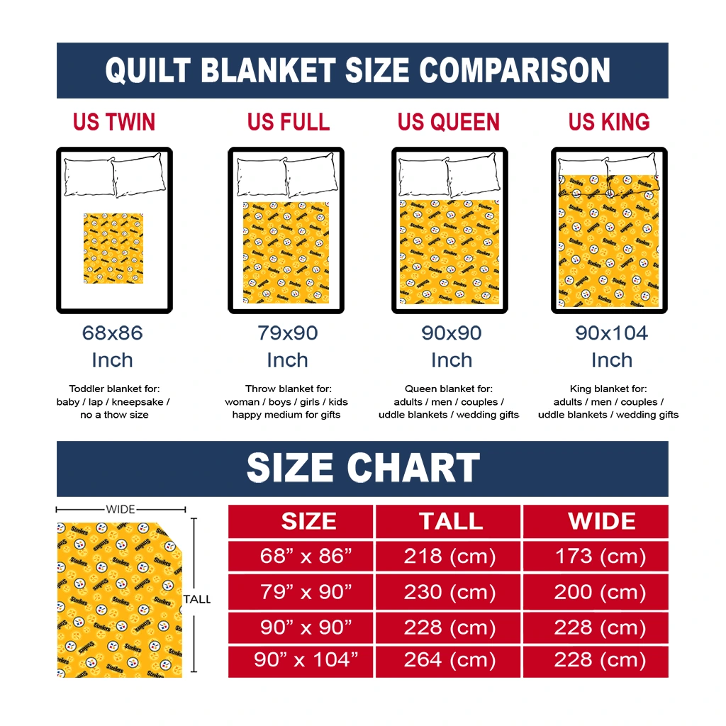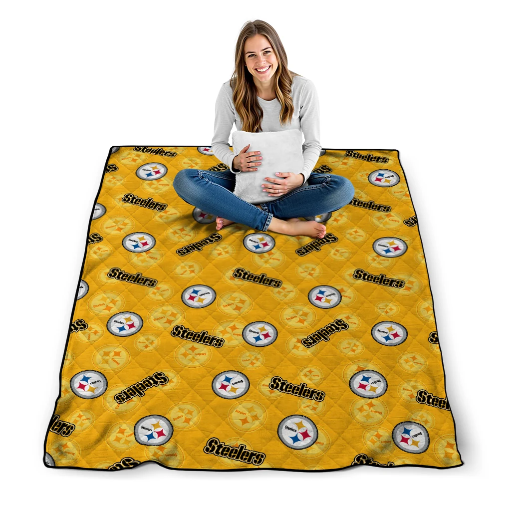 Wrap yourself in warmth and pride with the Pittsburgh Steelers Solid Classic Gold Quilt Blanket from the Pittsburgh Steelers Blankets collection at Yes That Blanket. Made from 100% premium quilting-weight polyester blended with a touch of microfiber, this quilt offers a smooth, soft finish you’ll love. Choose between two quilting styles—Stipple or Diagonal—and enjoy the comfort of a cotton-filled layer inside that adds extra coziness for every season. The border is available in classic black or white, giving your design a clean, timeless edge.