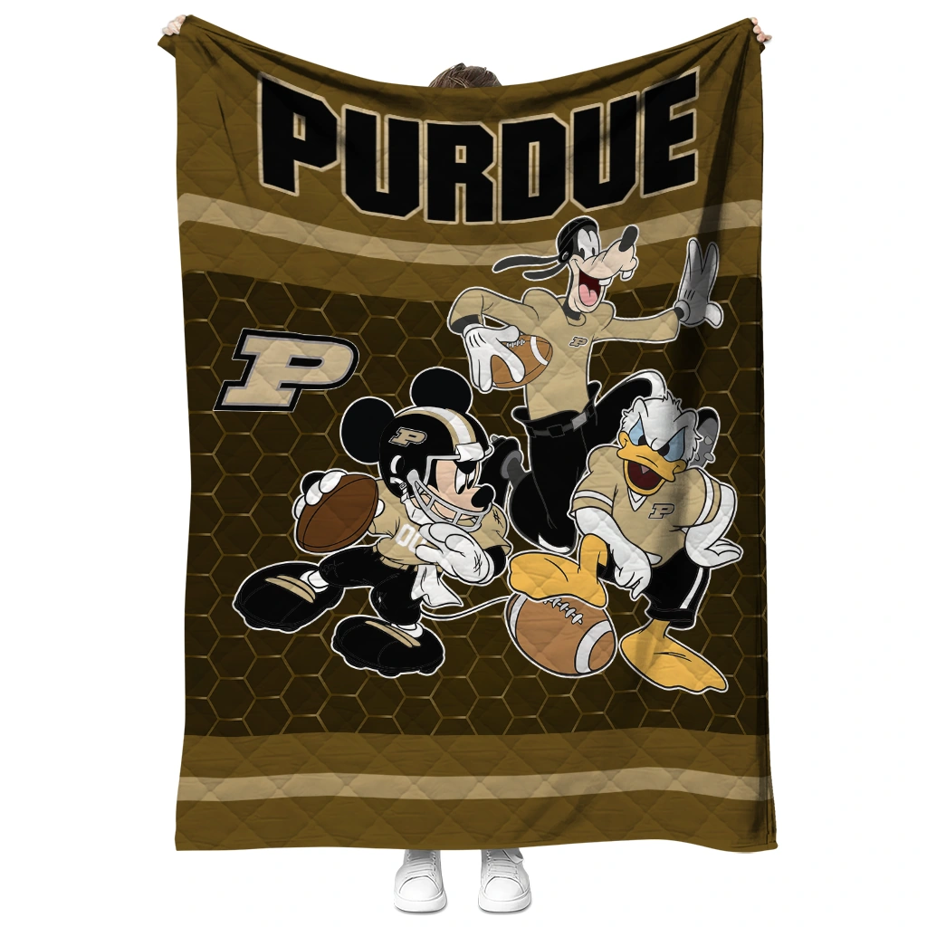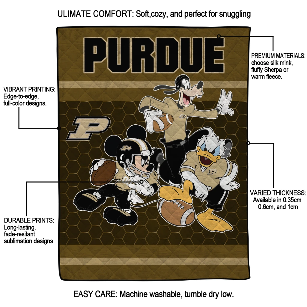 Wrap yourself in warmth and pride with the Purdue Boilermakers Disney Football Gold Quilt Blanket from the Purdue Boilermakers Blankets collection at Yes That Blanket. Made from 100% premium quilting-weight polyester blended with a touch of microfiber, this quilt offers a smooth, soft finish you’ll love. Choose between two quilting styles—Stipple or Diagonal—and enjoy the comfort of a cotton-filled layer inside that adds extra coziness for every season. The border is available in classic black or white, giving your design a clean, timeless edge.