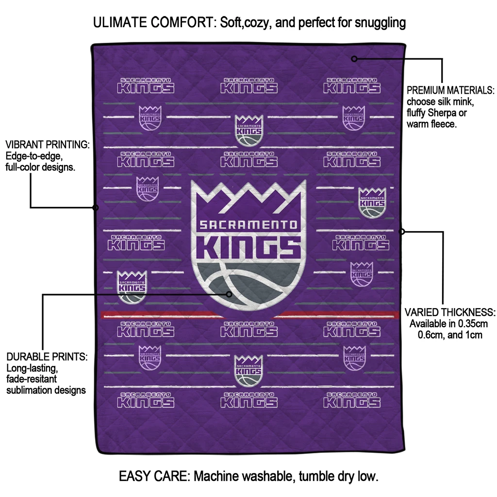 Wrap yourself in warmth and pride with the Sacramento Kings Handdrawn Stripes Purple Quilt Blanket from the Sacramento Kings Blankets collection at Yes That Blanket. Made from 100% premium quilting-weight polyester blended with a touch of microfiber, this quilt offers a smooth, soft finish you’ll love. Choose between two quilting styles—Stipple or Diagonal—and enjoy the comfort of a cotton-filled layer inside that adds extra coziness for every season. The border is available in classic black or white, giving your design a clean, timeless edge.