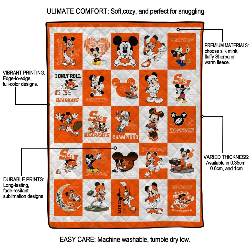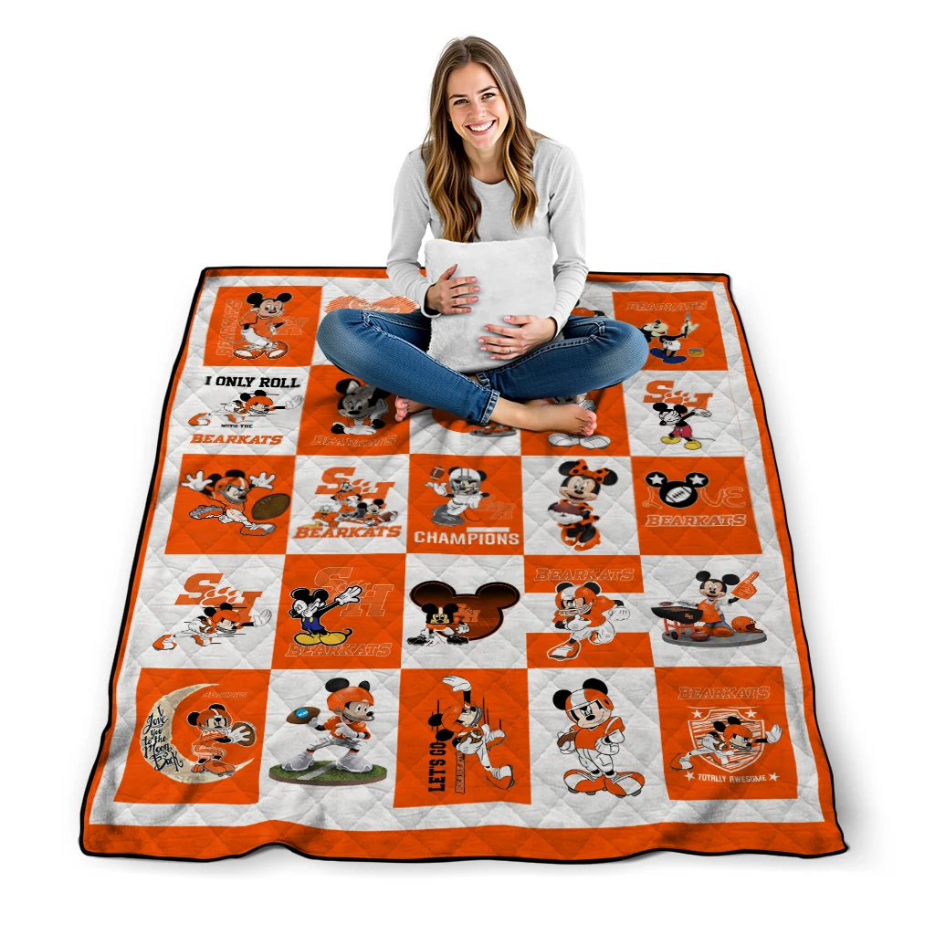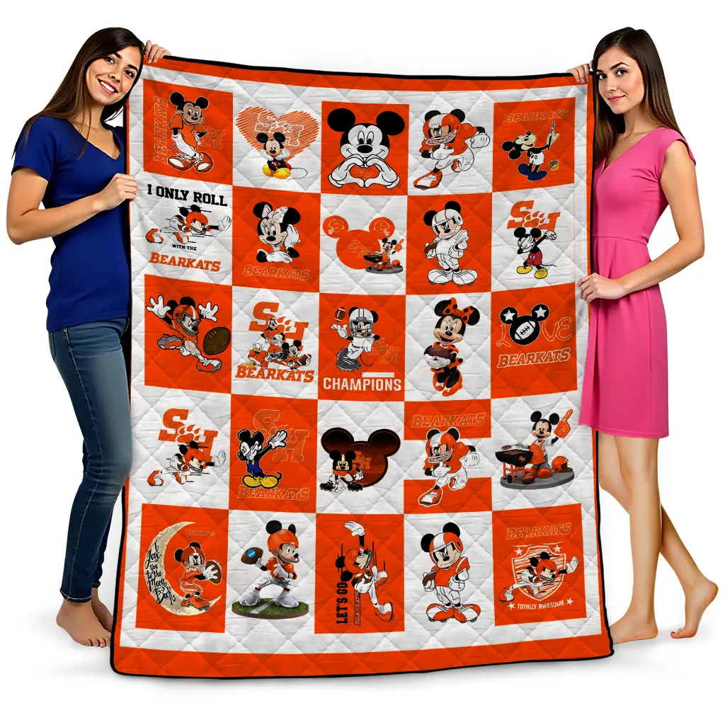 Wrap yourself in warmth and pride with the Sam Houston Bearkats Mickey Mouse Motif Orange White Quilt Blanket from the Sam Houston Bearkats Blankets collection at Yes That Blanket. Made from 100% premium quilting-weight polyester blended with a touch of microfiber, this quilt offers a smooth, soft finish you’ll love. Choose between two quilting styles—Stipple or Diagonal—and enjoy the comfort of a cotton-filled layer inside that adds extra coziness for every season. The border is available in classic black or white, giving your design a clean, timeless edge.