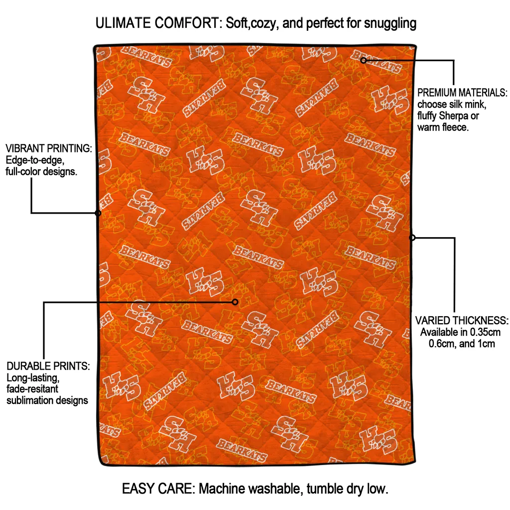 Wrap yourself in warmth and pride with the Sam Houston Bearkats Solid Classic Orange Quilt Blanket from the Sam Houston Bearkats Blankets collection at Yes That Blanket. Made from 100% premium quilting-weight polyester blended with a touch of microfiber, this quilt offers a smooth, soft finish you’ll love. Choose between two quilting styles—Stipple or Diagonal—and enjoy the comfort of a cotton-filled layer inside that adds extra coziness for every season. The border is available in classic black or white, giving your design a clean, timeless edge.
