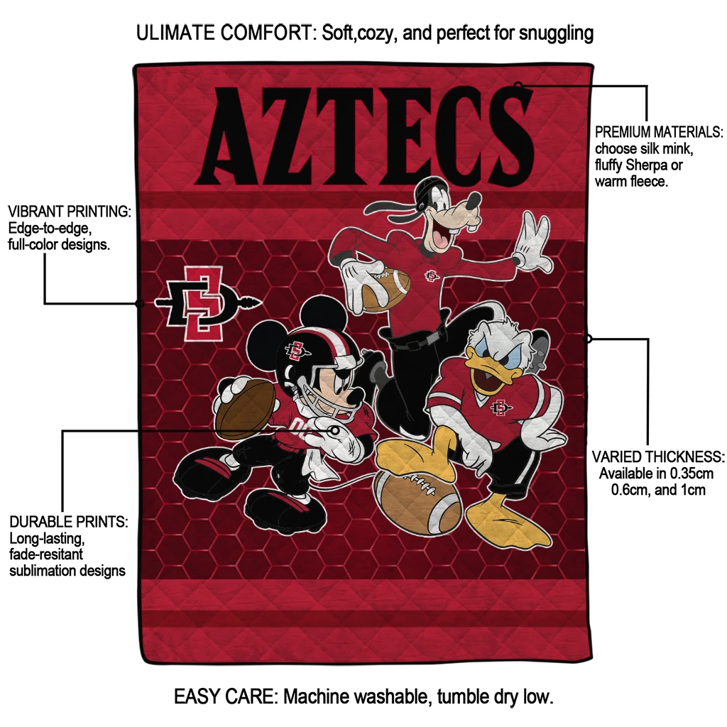 Wrap yourself in warmth and pride with the San Diego State Aztecs Disney Football Red Quilt Blanket from the San Diego State Aztecs Blankets collection at Yes That Blanket. Made from 100% premium quilting-weight polyester blended with a touch of microfiber, this quilt offers a smooth, soft finish you’ll love. Choose between two quilting styles—Stipple or Diagonal—and enjoy the comfort of a cotton-filled layer inside that adds extra coziness for every season. The border is available in classic black or white, giving your design a clean, timeless edge.