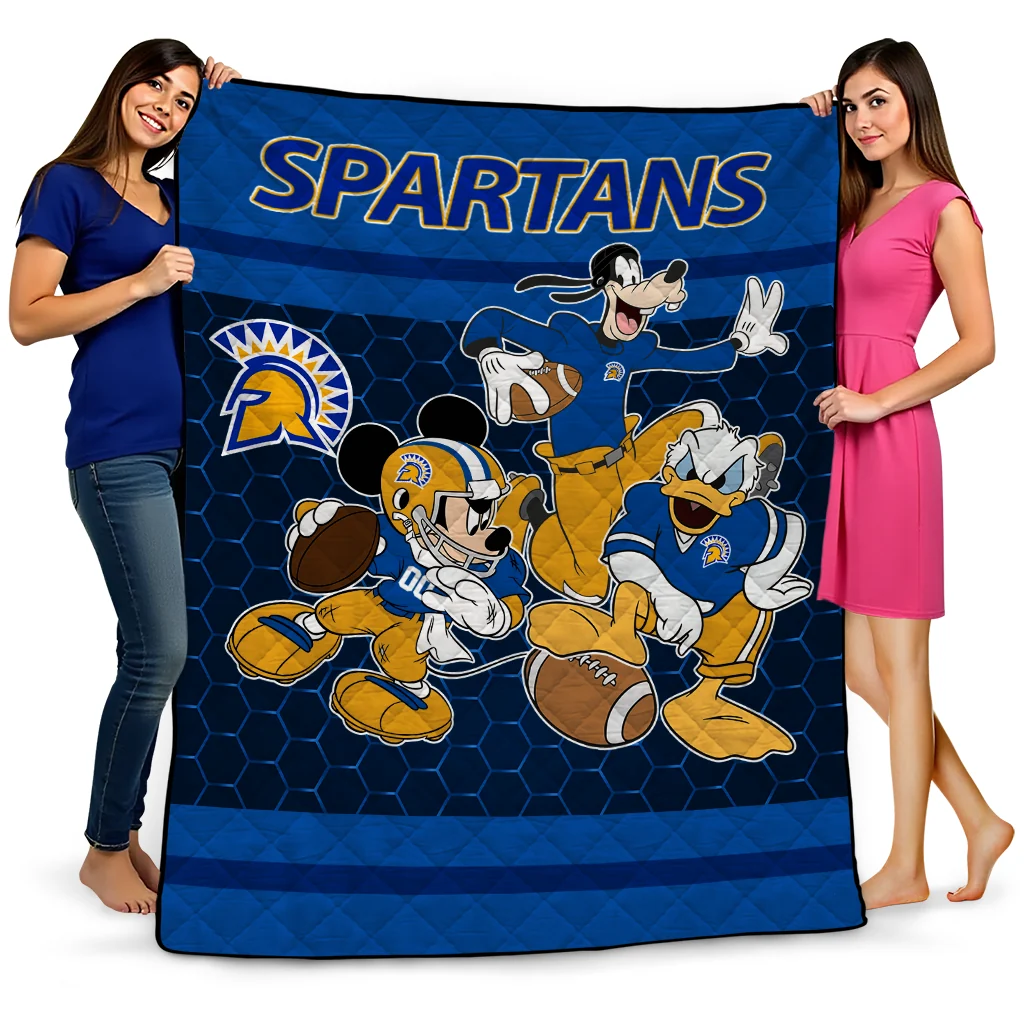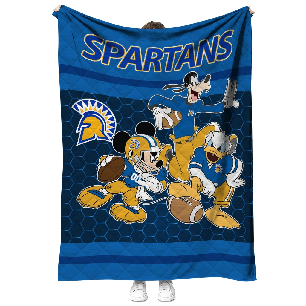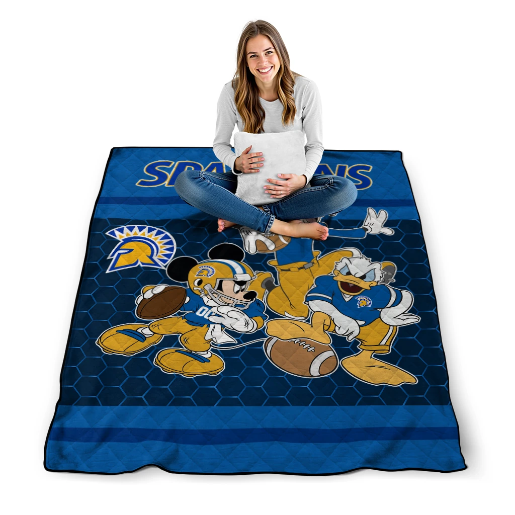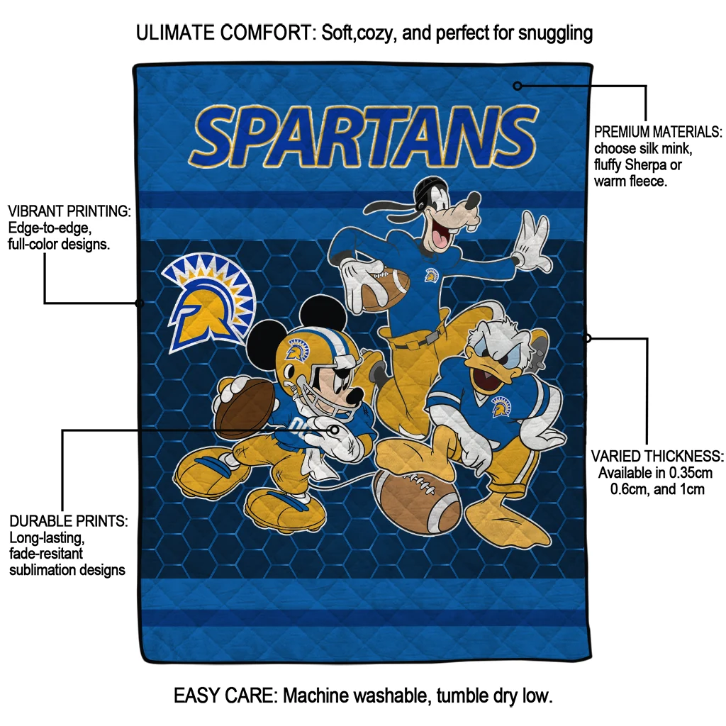 Wrap yourself in warmth and pride with the San Jose State Spartans Disney Football Blue Quilt Blanket from the San Jose State Spartans Blankets collection at Yes That Blanket. Made from 100% premium quilting-weight polyester blended with a touch of microfiber, this quilt offers a smooth, soft finish you’ll love. Choose between two quilting styles—Stipple or Diagonal—and enjoy the comfort of a cotton-filled layer inside that adds extra coziness for every season. The border is available in classic black or white, giving your design a clean, timeless edge.