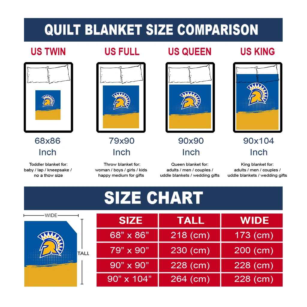 Wrap yourself in warmth and pride with the San Jose State Spartans Dot Illusion Blue Quilt Blanket from the San Jose State Spartans Blankets collection at Yes That Blanket. Made from 100% premium quilting-weight polyester blended with a touch of microfiber, this quilt offers a smooth, soft finish you’ll love. Choose between two quilting styles—Stipple or Diagonal—and enjoy the comfort of a cotton-filled layer inside that adds extra coziness for every season. The border is available in classic black or white, giving your design a clean, timeless edge.