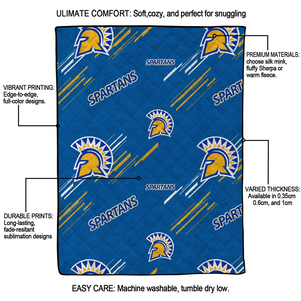 Wrap yourself in warmth and pride with the San Jose State Spartans Sketch Lines Blue Quilt Blanket from the San Jose State Spartans Blankets collection at Yes That Blanket. Made from 100% premium quilting-weight polyester blended with a touch of microfiber, this quilt offers a smooth, soft finish you’ll love. Choose between two quilting styles—Stipple or Diagonal—and enjoy the comfort of a cotton-filled layer inside that adds extra coziness for every season. The border is available in classic black or white, giving your design a clean, timeless edge.