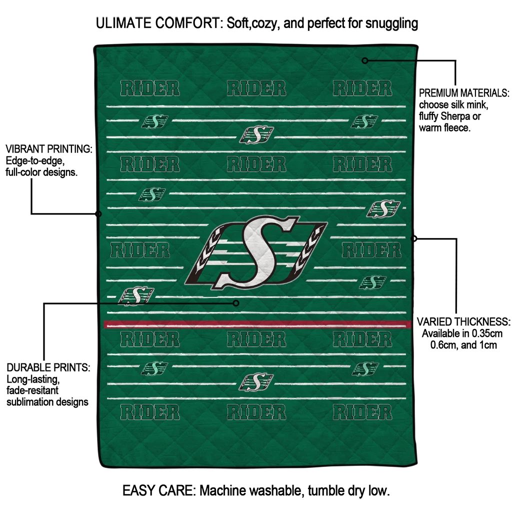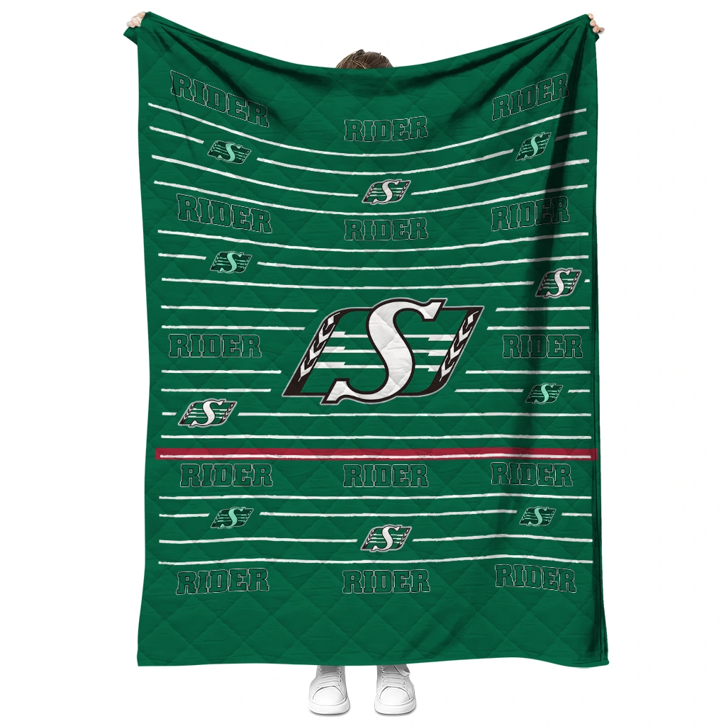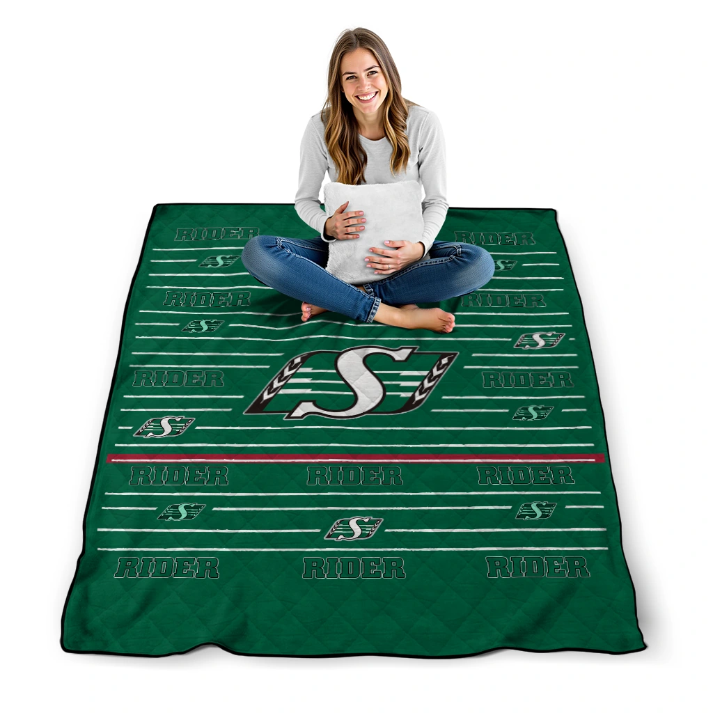 Wrap yourself in warmth and pride with the Saskatchewan Roughriders Handdrawn Stripes Green Quilt Blanket from the Saskatchewan Roughriders Blankets collection at Yes That Blanket. Made from 100% premium quilting-weight polyester blended with a touch of microfiber, this quilt offers a smooth, soft finish you’ll love. Choose between two quilting styles—Stipple or Diagonal—and enjoy the comfort of a cotton-filled layer inside that adds extra coziness for every season. The border is available in classic black or white, giving your design a clean, timeless edge.