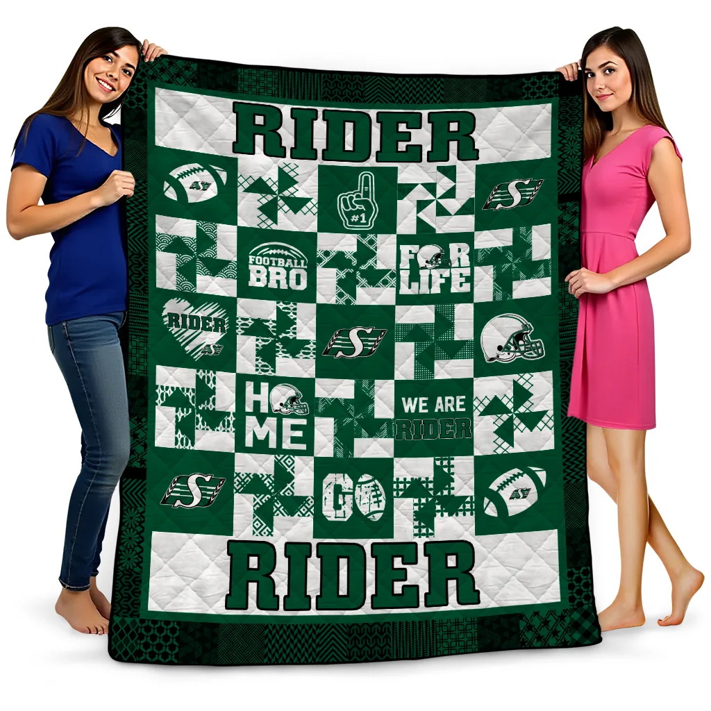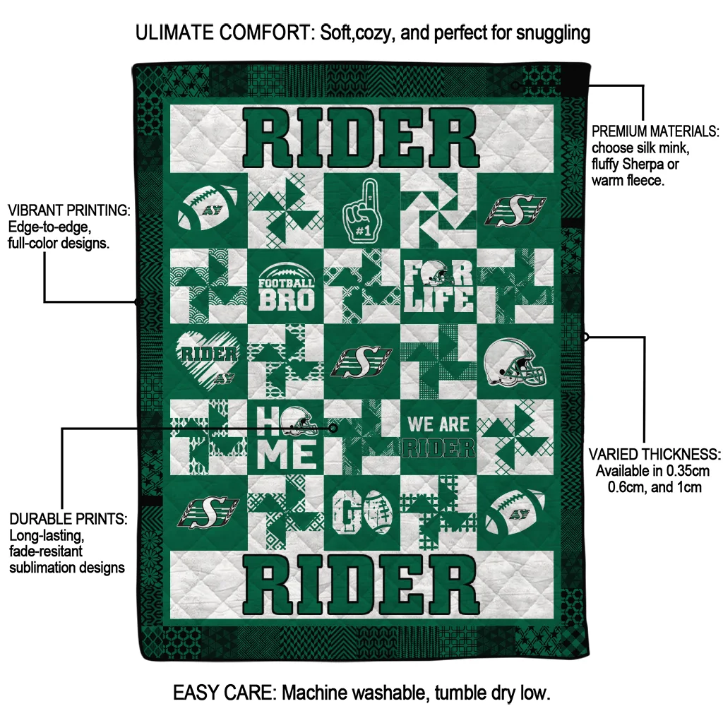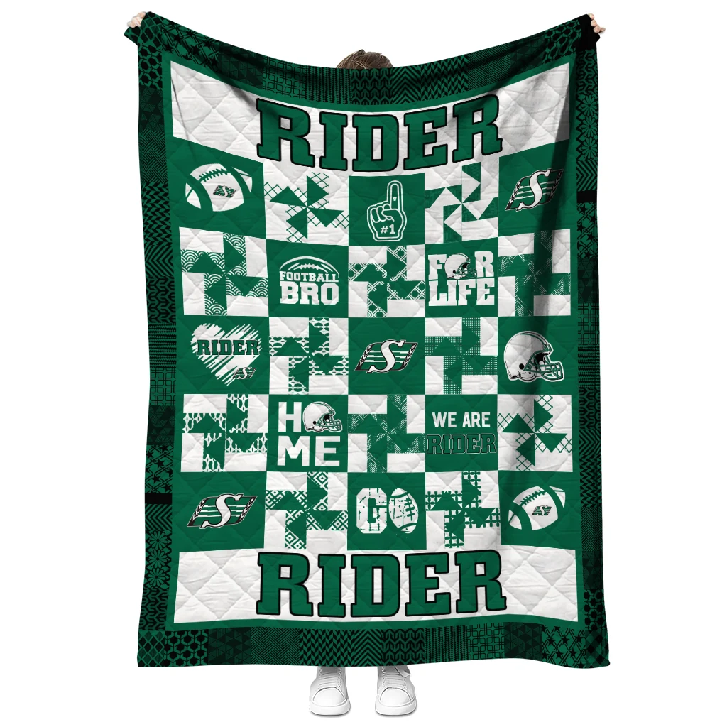 Wrap yourself in warmth and pride with the Saskatchewan Roughriders Helmet Heart Green Quilt Blanket from the Saskatchewan Roughriders Blankets collection at Yes That Blanket. Made from 100% premium quilting-weight polyester blended with a touch of microfiber, this quilt offers a smooth, soft finish you’ll love. Choose between two quilting styles—Stipple or Diagonal—and enjoy the comfort of a cotton-filled layer inside that adds extra coziness for every season. The border is available in classic black or white, giving your design a clean, timeless edge.