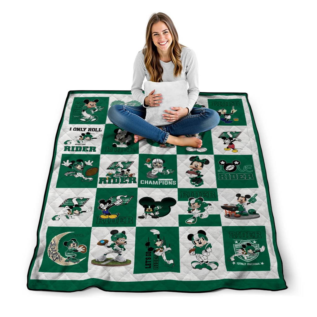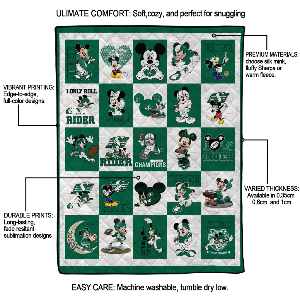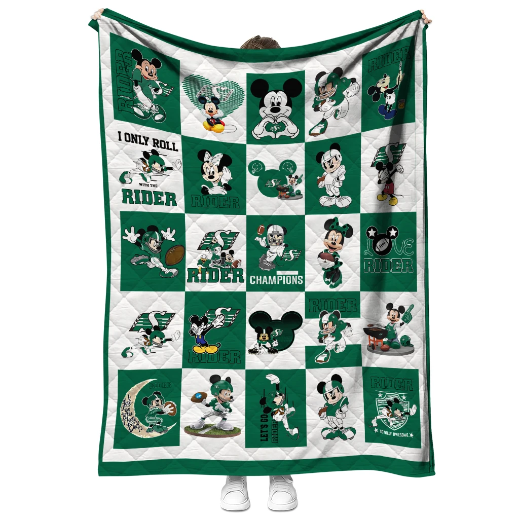 Wrap yourself in warmth and pride with the Saskatchewan Roughriders Mickey Mouse Motif Green White Quilt Blanket from the Saskatchewan Roughriders Blankets collection at Yes That Blanket. Made from 100% premium quilting-weight polyester blended with a touch of microfiber, this quilt offers a smooth, soft finish you’ll love. Choose between two quilting styles—Stipple or Diagonal—and enjoy the comfort of a cotton-filled layer inside that adds extra coziness for every season. The border is available in classic black or white, giving your design a clean, timeless edge.