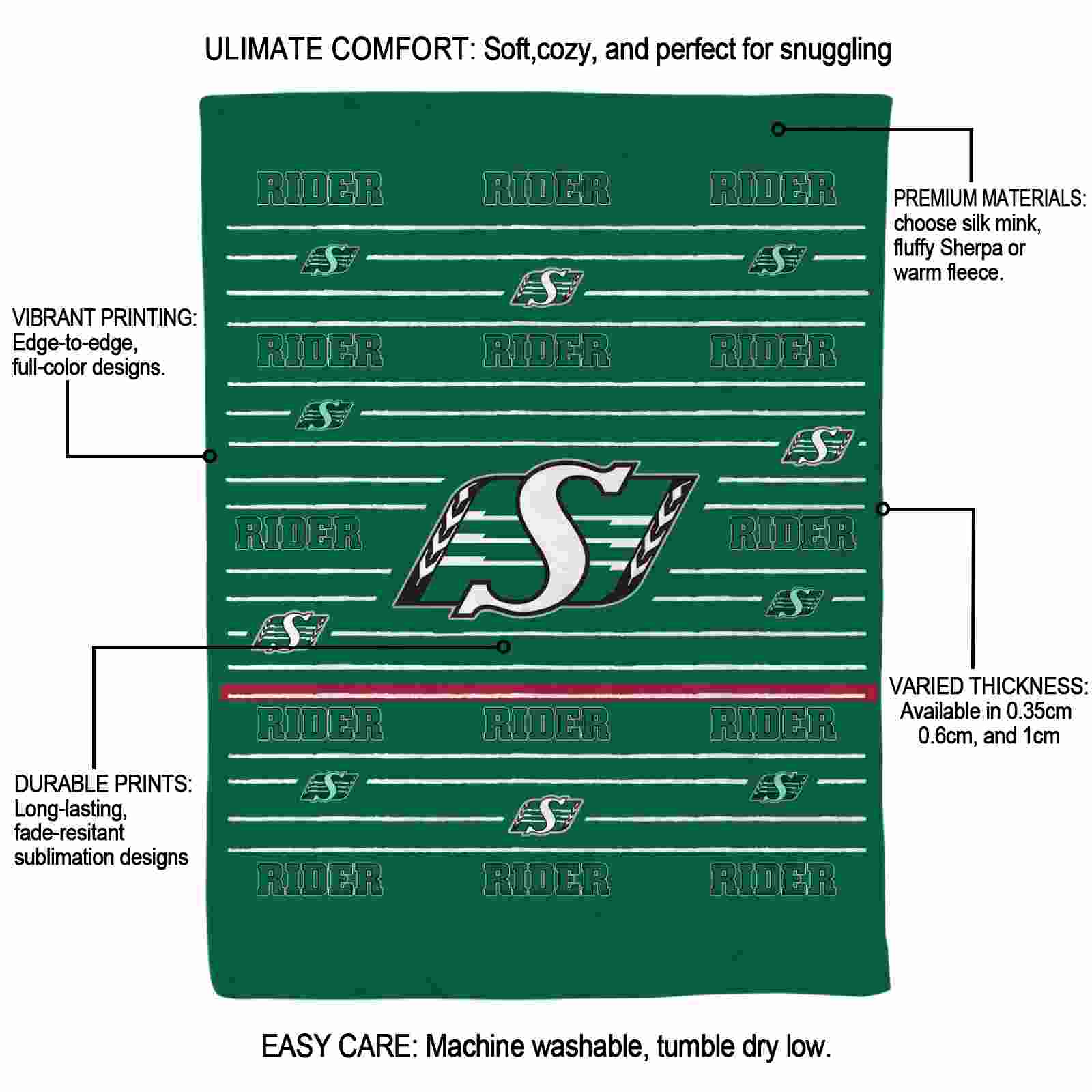 Without a doubt, the Saskatchewan Roughriders Striped Pattern Green Blanket from Saskatchewan Roughriders Blankets collection is offering true fans a chance to showcase passion in a cool way. Personalize it with your favorite team's logo or a meaningful name to make it uniquely yours. Isn't that great? The full-color print ensures vibrant, edge-to-edge designs, bringing your sports enthusiasm to life!