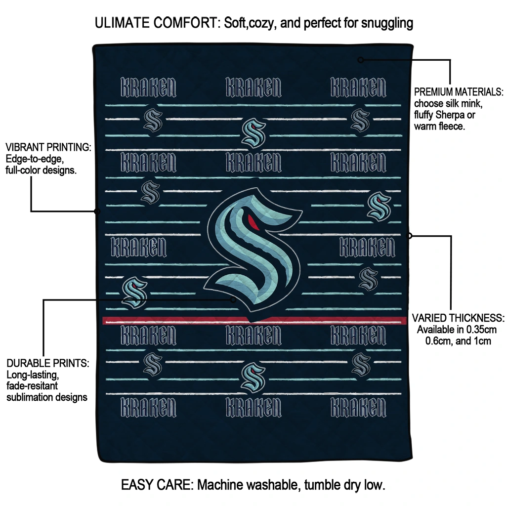 The Seattle Kraken Handdrawn Stripes Blue Quilt Blanket is more than a blanket—it’s everyday comfort, thoughtfully made. Crafted from premium quilting fabric with a soft microfiber touch, it offers a smooth hand-feel and lasting coziness. Layered quilting with a cotton-filled core provides adaptable warmth across seasons while maintaining a clean, tailored look on your bed or sofa.