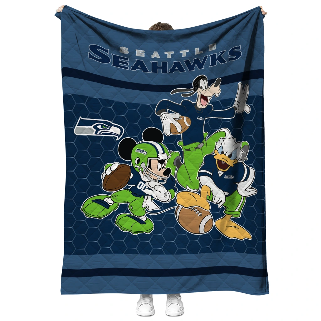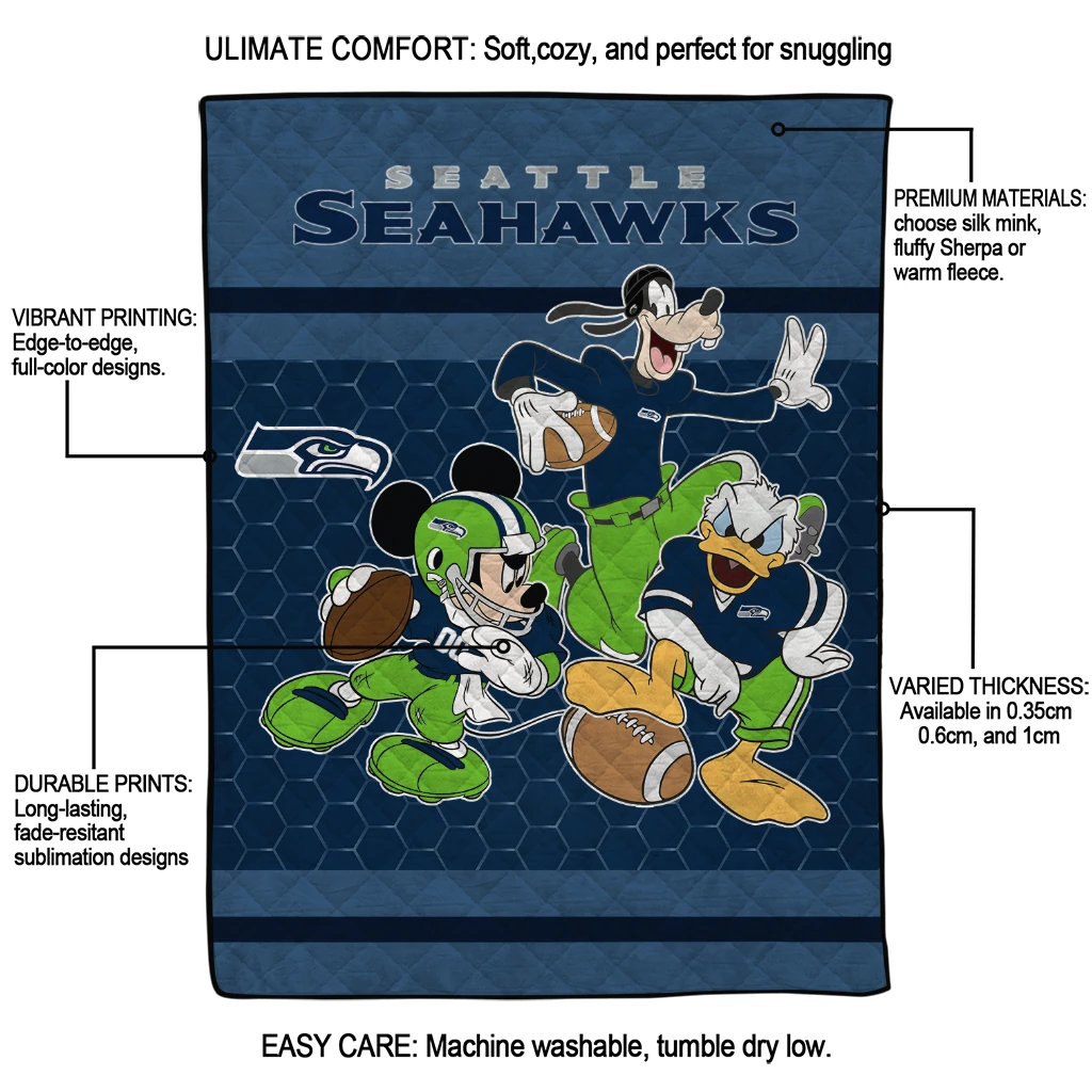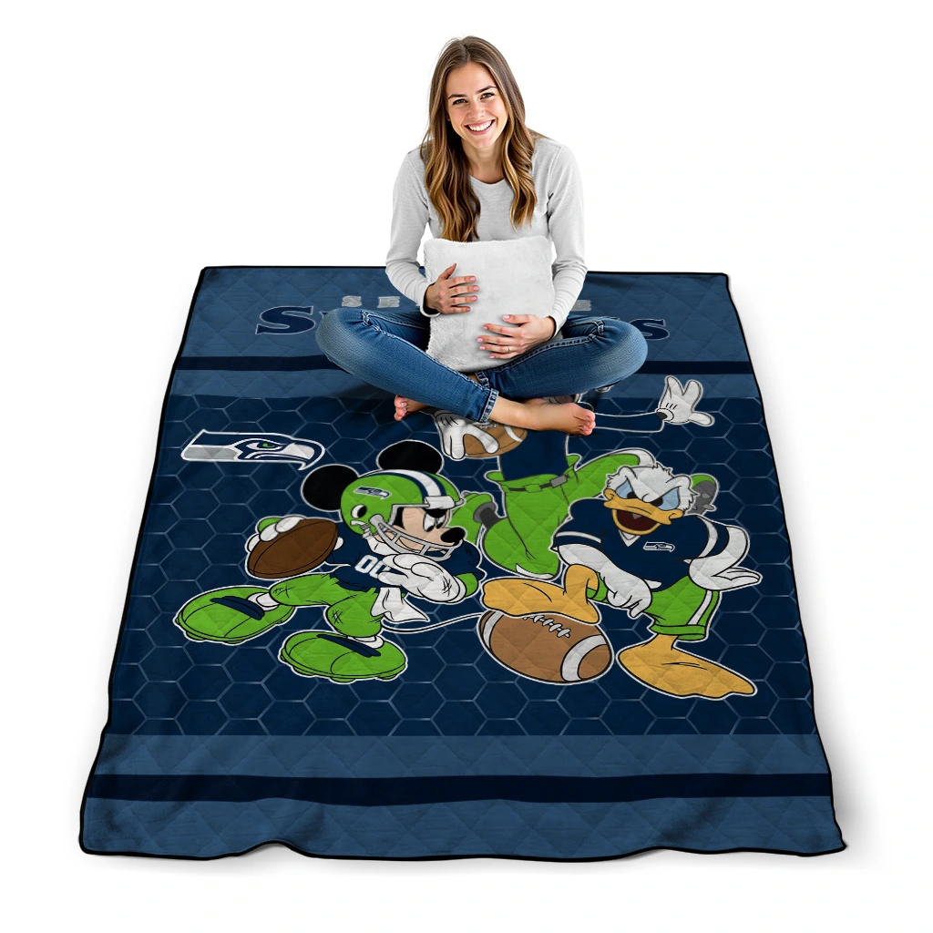 Wrap yourself in warmth and pride with the Seattle Seahawks Disney Football Blue Quilt Blanket from the Seattle Seahawks Blankets collection at Yes That Blanket. Made from 100% premium quilting-weight polyester blended with a touch of microfiber, this quilt offers a smooth, soft finish you’ll love. Choose between two quilting styles—Stipple or Diagonal—and enjoy the comfort of a cotton-filled layer inside that adds extra coziness for every season. The border is available in classic black or white, giving your design a clean, timeless edge.