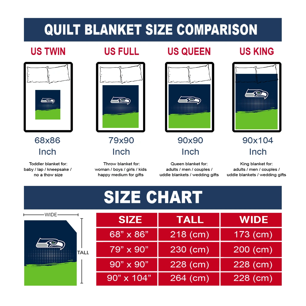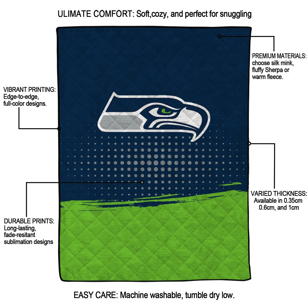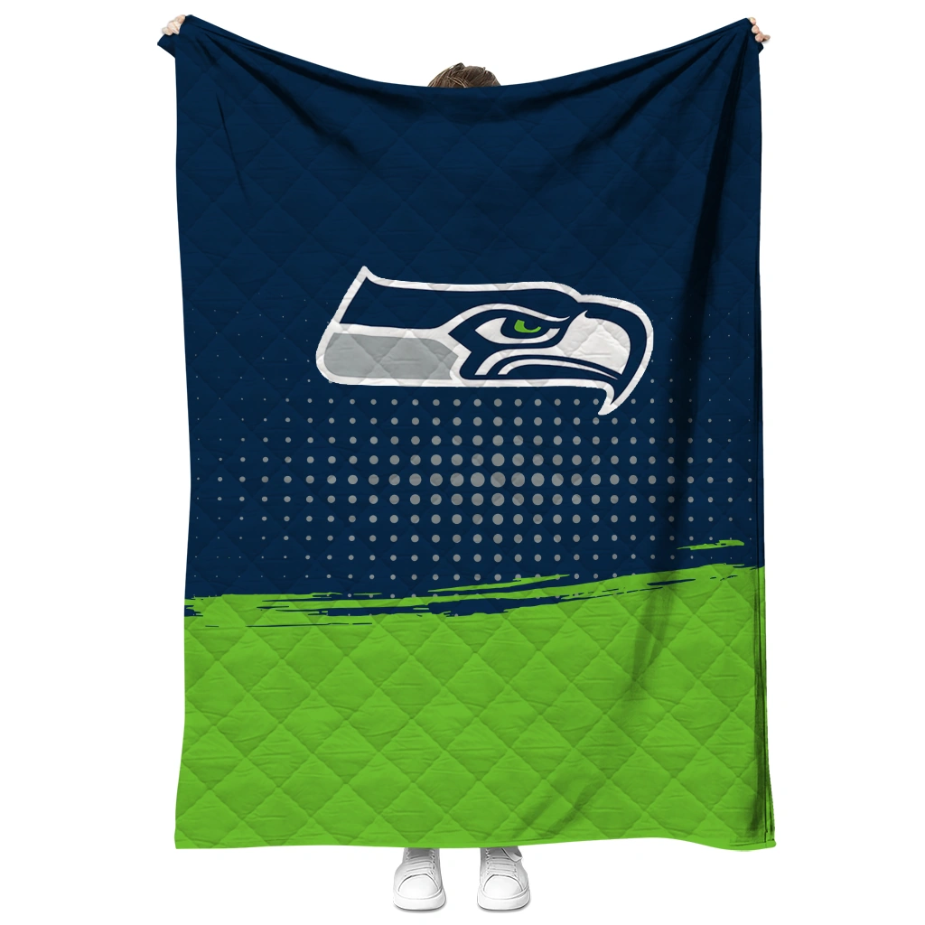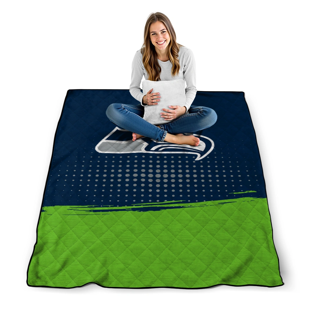 Wrap yourself in warmth and pride with the Seattle Seahawks Dot Illusion Blue Quilt Blanket from the Seattle Seahawks Blankets collection at Yes That Blanket. Made from 100% premium quilting-weight polyester blended with a touch of microfiber, this quilt offers a smooth, soft finish you’ll love. Choose between two quilting styles—Stipple or Diagonal—and enjoy the comfort of a cotton-filled layer inside that adds extra coziness for every season. The border is available in classic black or white, giving your design a clean, timeless edge.