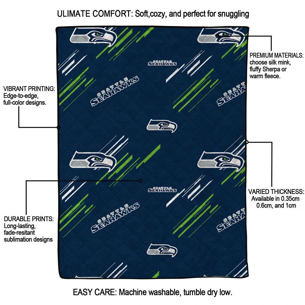Wrap yourself in warmth and pride with the Seattle Seahawks Sketch Lines Blue Quilt Blanket from the Seattle Seahawks Blankets collection at Yes That Blanket. Made from 100% premium quilting-weight polyester blended with a touch of microfiber, this quilt offers a smooth, soft finish you’ll love. Choose between two quilting styles—Stipple or Diagonal—and enjoy the comfort of a cotton-filled layer inside that adds extra coziness for every season. The border is available in classic black or white, giving your design a clean, timeless edge.