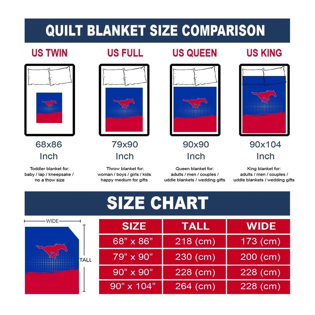 Wrap yourself in warmth and pride with the SMU Mustangs Dot Illusion Blue Quilt Blanket from the SMU Mustangs Blankets collection at Yes That Blanket. Made from 100% premium quilting-weight polyester blended with a touch of microfiber, this quilt offers a smooth, soft finish you’ll love. Choose between two quilting styles—Stipple or Diagonal—and enjoy the comfort of a cotton-filled layer inside that adds extra coziness for every season. The border is available in classic black or white, giving your design a clean, timeless edge.