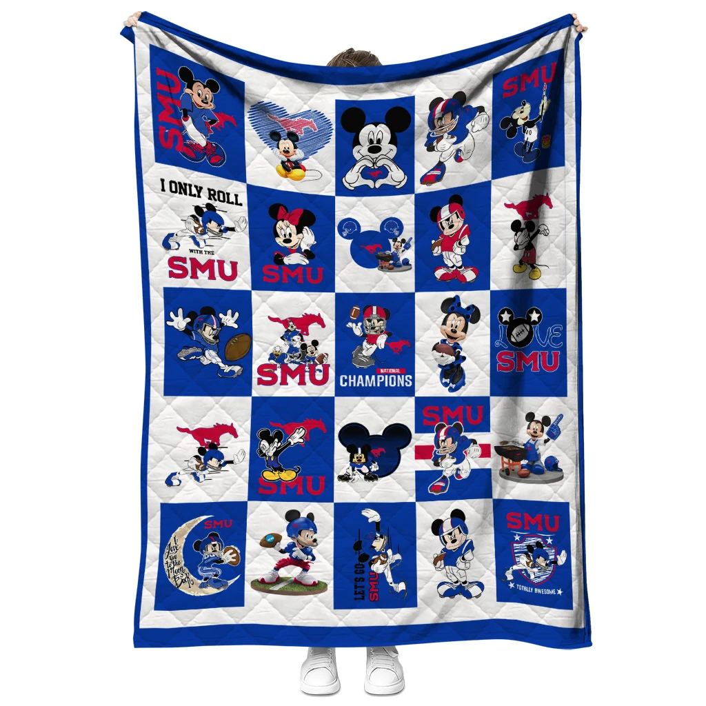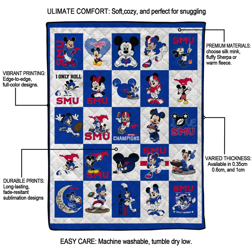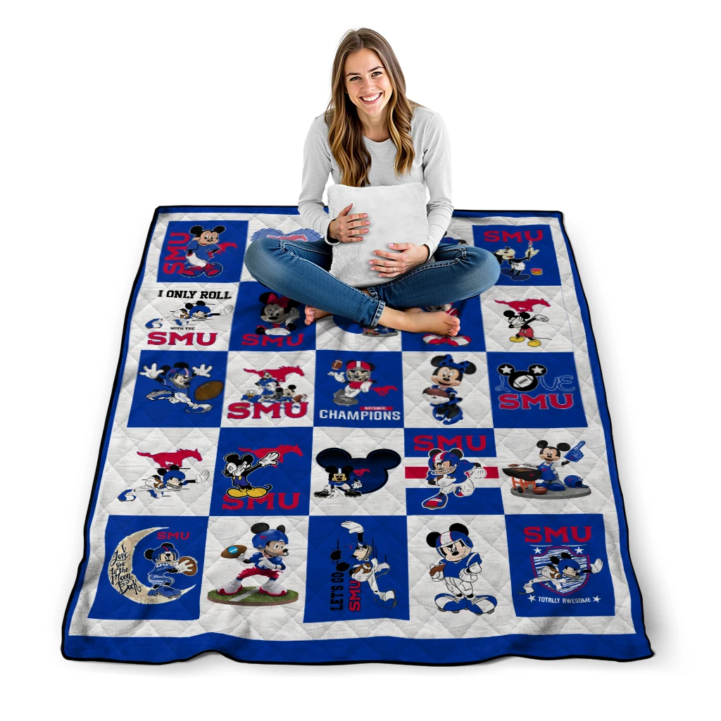 Wrap yourself in warmth and pride with the SMU Mustangs Mickey Mouse Motif Blue White Quilt Blanket from the SMU Mustangs Blankets collection at Yes That Blanket. Made from 100% premium quilting-weight polyester blended with a touch of microfiber, this quilt offers a smooth, soft finish you’ll love. Choose between two quilting styles—Stipple or Diagonal—and enjoy the comfort of a cotton-filled layer inside that adds extra coziness for every season. The border is available in classic black or white, giving your design a clean, timeless edge.