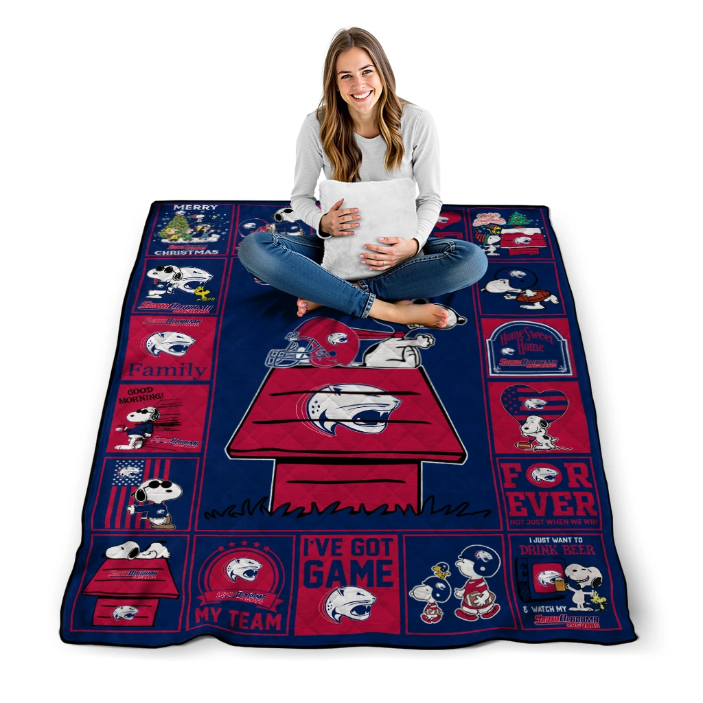 Wrap yourself in warmth and pride with the South Alabama Jaguars Snoopy Love Blue Quilt Blanket from the South Alabama Jaguars Blankets collection at Yes That Blanket. Made from 100% premium quilting-weight polyester blended with a touch of microfiber, this quilt offers a smooth, soft finish you’ll love. Choose between two quilting styles—Stipple or Diagonal—and enjoy the comfort of a cotton-filled layer inside that adds extra coziness for every season. The border is available in classic black or white, giving your design a clean, timeless edge.