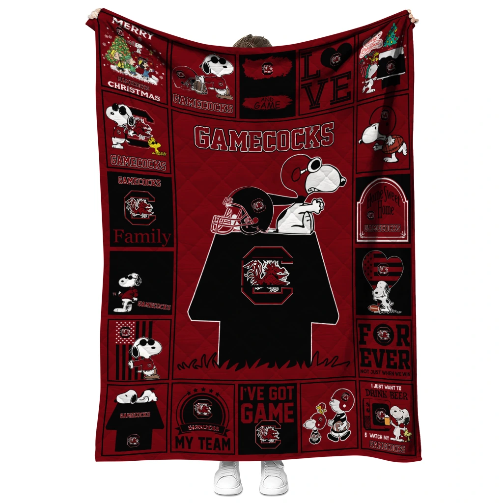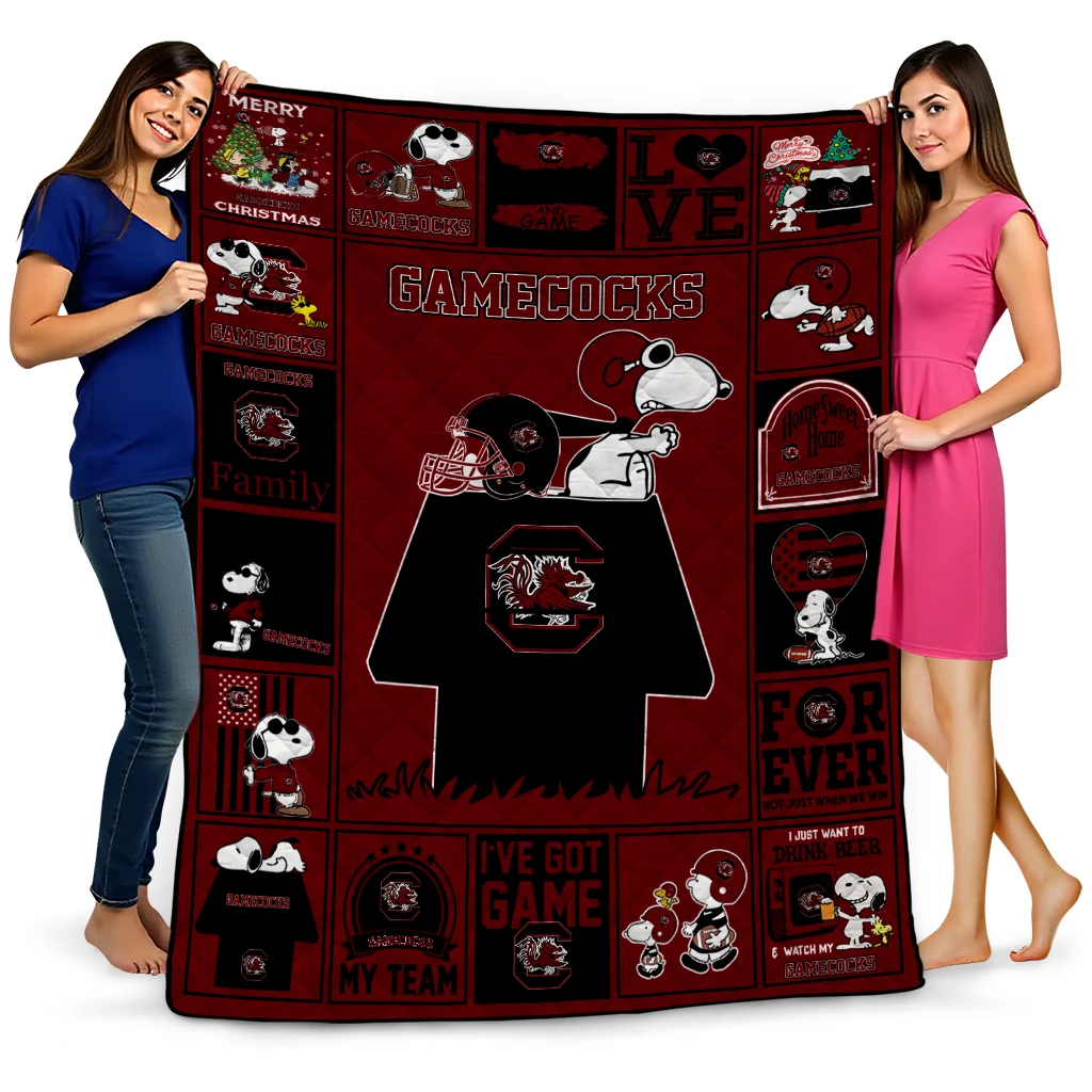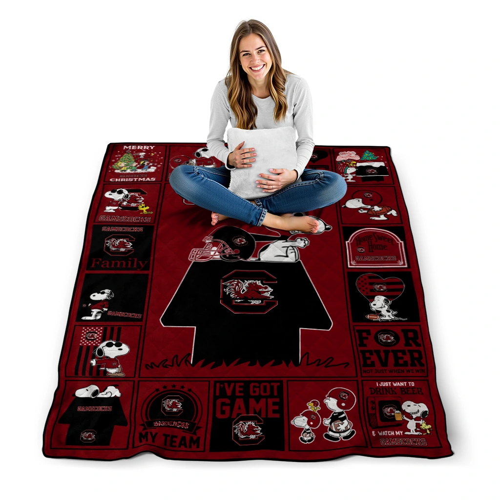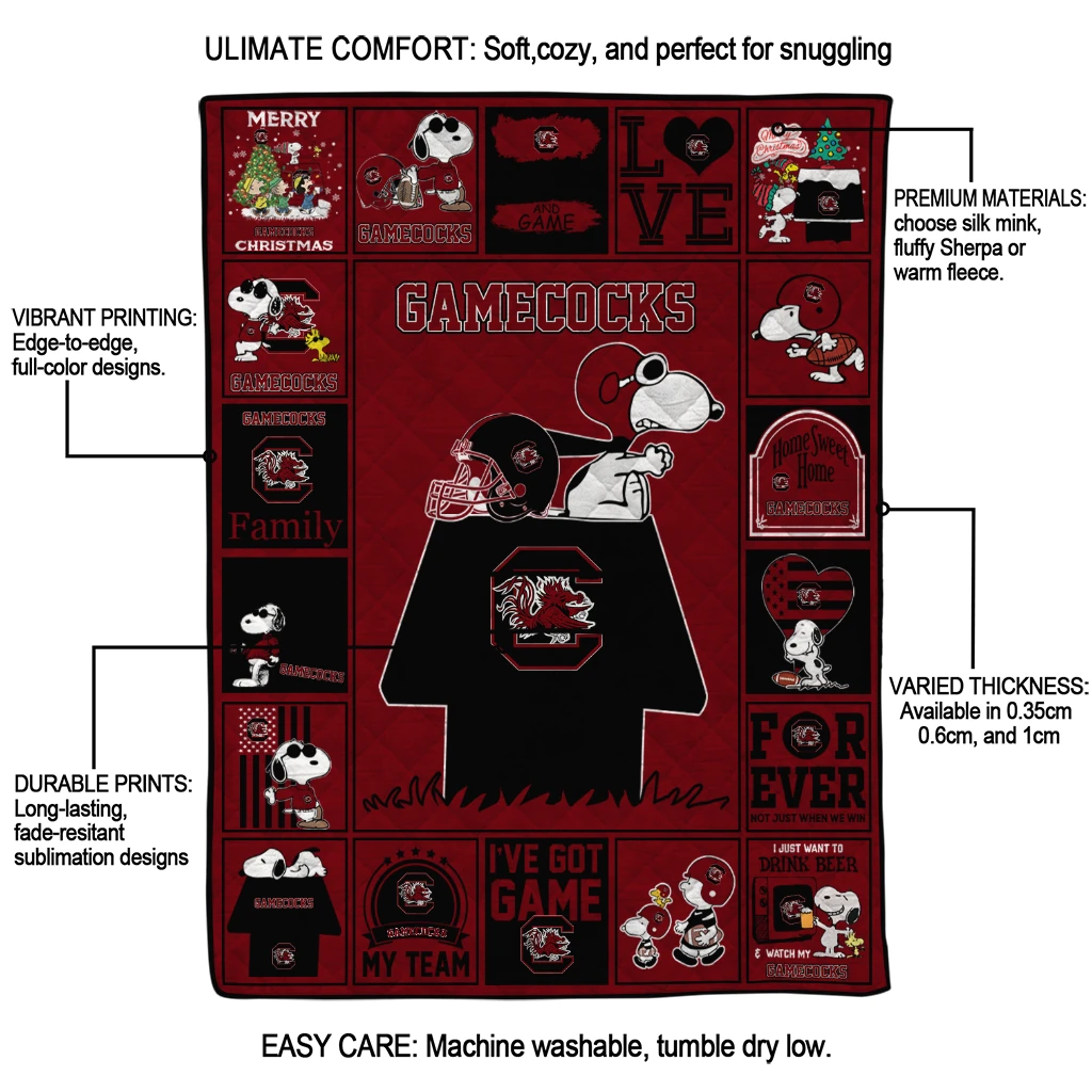 Wrap yourself in warmth and pride with the South Carolina Gamecocks Snoopy Love Garnet Quilt Blanket from the South Carolina Gamecocks Blankets collection at Yes That Blanket. Made from 100% premium quilting-weight polyester blended with a touch of microfiber, this quilt offers a smooth, soft finish you’ll love. Choose between two quilting styles—Stipple or Diagonal—and enjoy the comfort of a cotton-filled layer inside that adds extra coziness for every season. The border is available in classic black or white, giving your design a clean, timeless edge.
