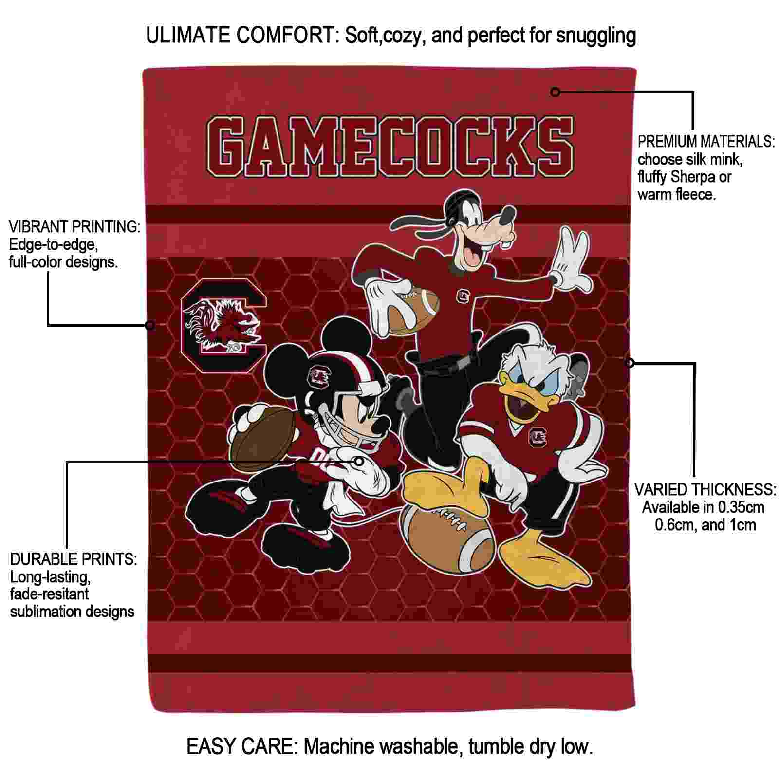 The South Carolina Gamecocks Three Musketeers Garnet Blanket isn’t just a blanket—it’s your connection to the game. Snuggle up while reliving legendary plays or dreaming of future championships. Its bold, team-inspired designs keep your love for the sport front and center, while its easy-care durability means it’s always ready for your next adventure. From cheering at home to showcasing your loyalty on the go, this item of NCAA Blankets collection is made for fans who live and breathe the game.