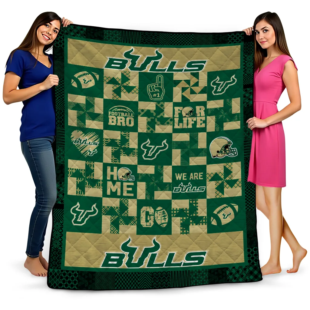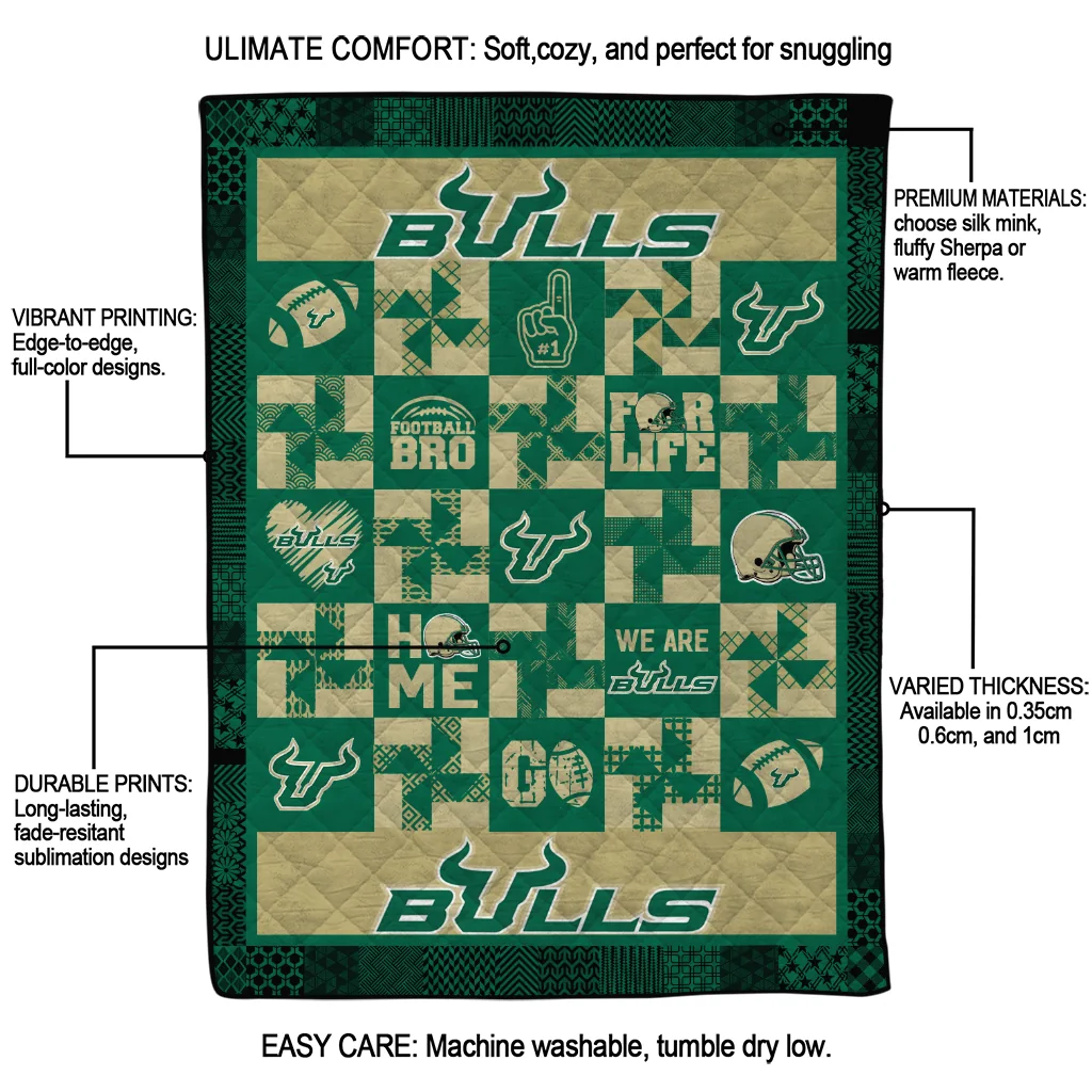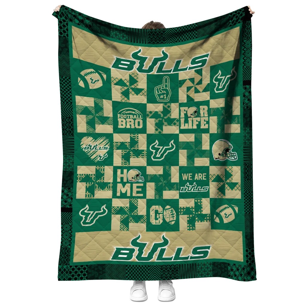 Wrap yourself in warmth and pride with the South Florida Bulls Helmet Heart Green Quilt Blanket from the South Florida Bulls Blankets collection at Yes That Blanket. Made from 100% premium quilting-weight polyester blended with a touch of microfiber, this quilt offers a smooth, soft finish you’ll love. Choose between two quilting styles—Stipple or Diagonal—and enjoy the comfort of a cotton-filled layer inside that adds extra coziness for every season. The border is available in classic black or white, giving your design a clean, timeless edge.