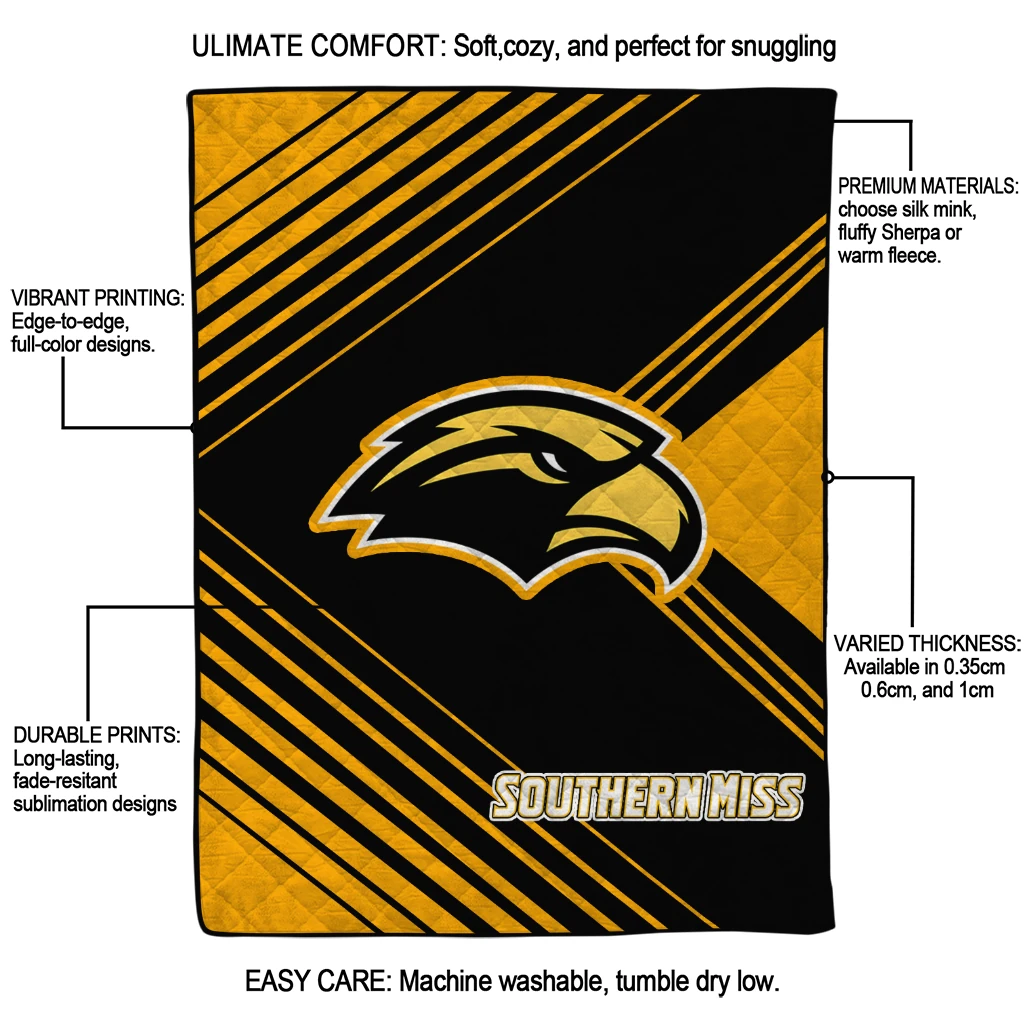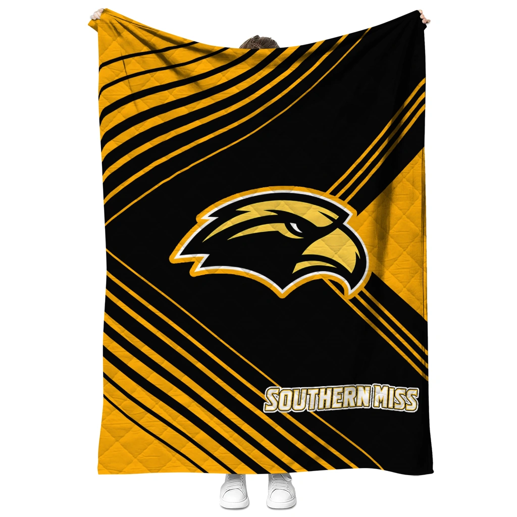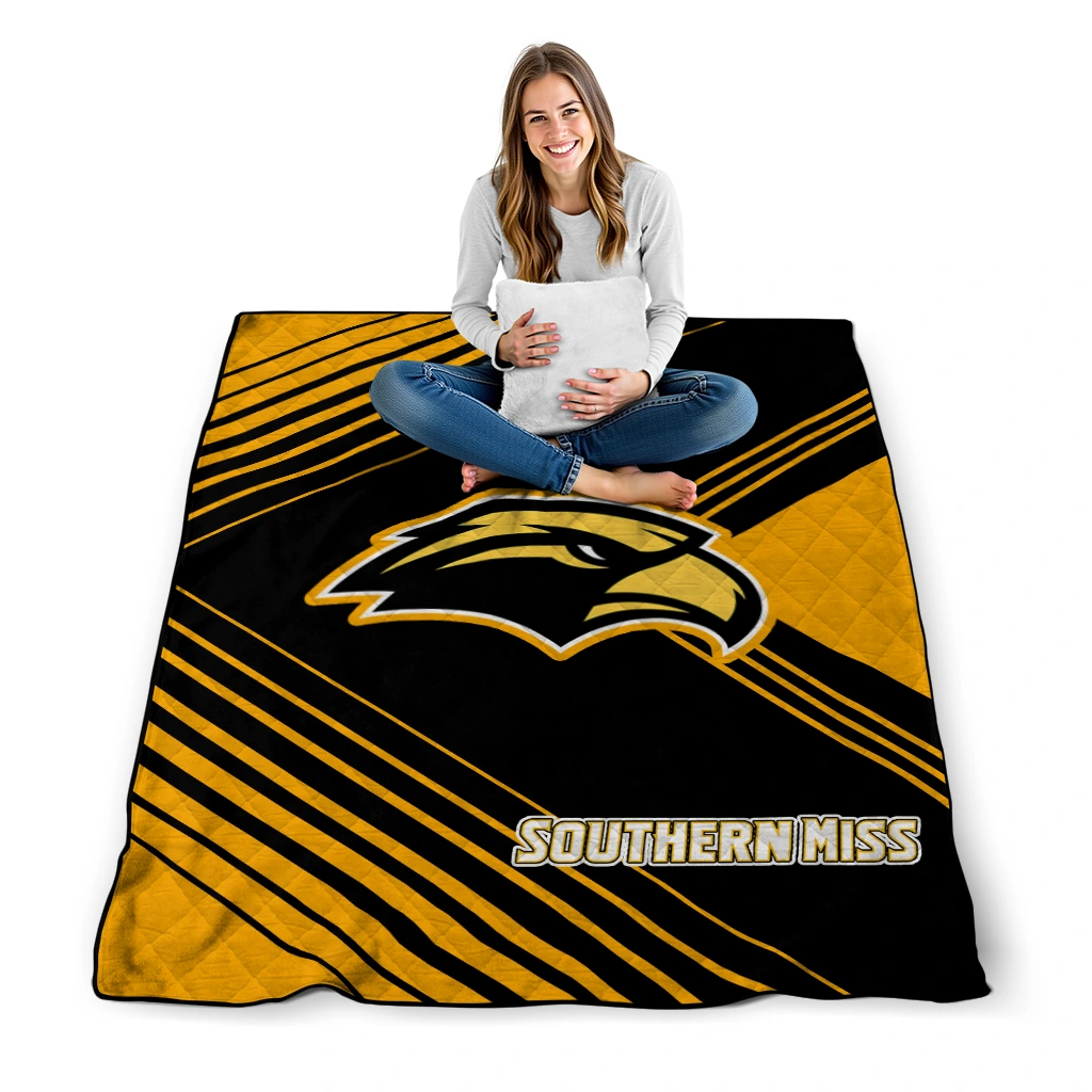 Wrap yourself in warmth and pride with the Southern Miss Golden Eagles Arrow Layers Black Quilt Blanket from the Southern Miss Golden Eagles Blankets collection at Yes That Blanket. Made from 100% premium quilting-weight polyester blended with a touch of microfiber, this quilt offers a smooth, soft finish you’ll love. Choose between two quilting styles—Stipple or Diagonal—and enjoy the comfort of a cotton-filled layer inside that adds extra coziness for every season. The border is available in classic black or white, giving your design a clean, timeless edge.