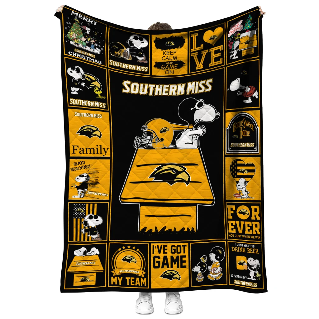 Wrap yourself in warmth and pride with the Southern Miss Golden Eagles Snoopy Love Black Quilt Blanket from the Southern Miss Golden Eagles Blankets collection at Yes That Blanket. Made from 100% premium quilting-weight polyester blended with a touch of microfiber, this quilt offers a smooth, soft finish you’ll love. Choose between two quilting styles—Stipple or Diagonal—and enjoy the comfort of a cotton-filled layer inside that adds extra coziness for every season. The border is available in classic black or white, giving your design a clean, timeless edge.