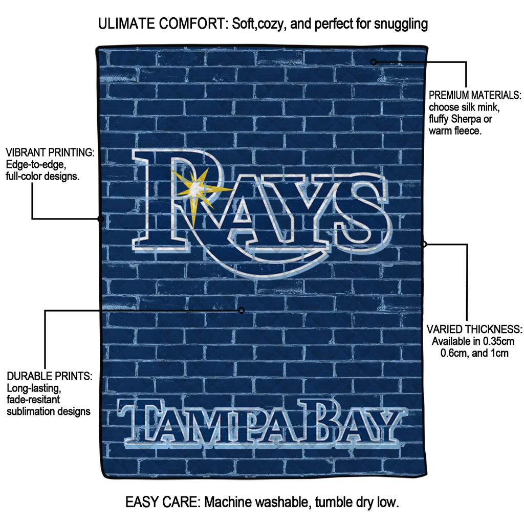Wrap yourself in warmth and pride with the Tampa Bay Rays Brick Grid Navy Quilt Blanket from the Tampa Bay Rays Blankets collection at Yes That Blanket. Made from 100% premium quilting-weight polyester blended with a touch of microfiber, this quilt offers a smooth, soft finish you’ll love. Choose between two quilting styles—Stipple or Diagonal—and enjoy the comfort of a cotton-filled layer inside that adds extra coziness for every season. The border is available in classic black or white, giving your design a clean, timeless edge.