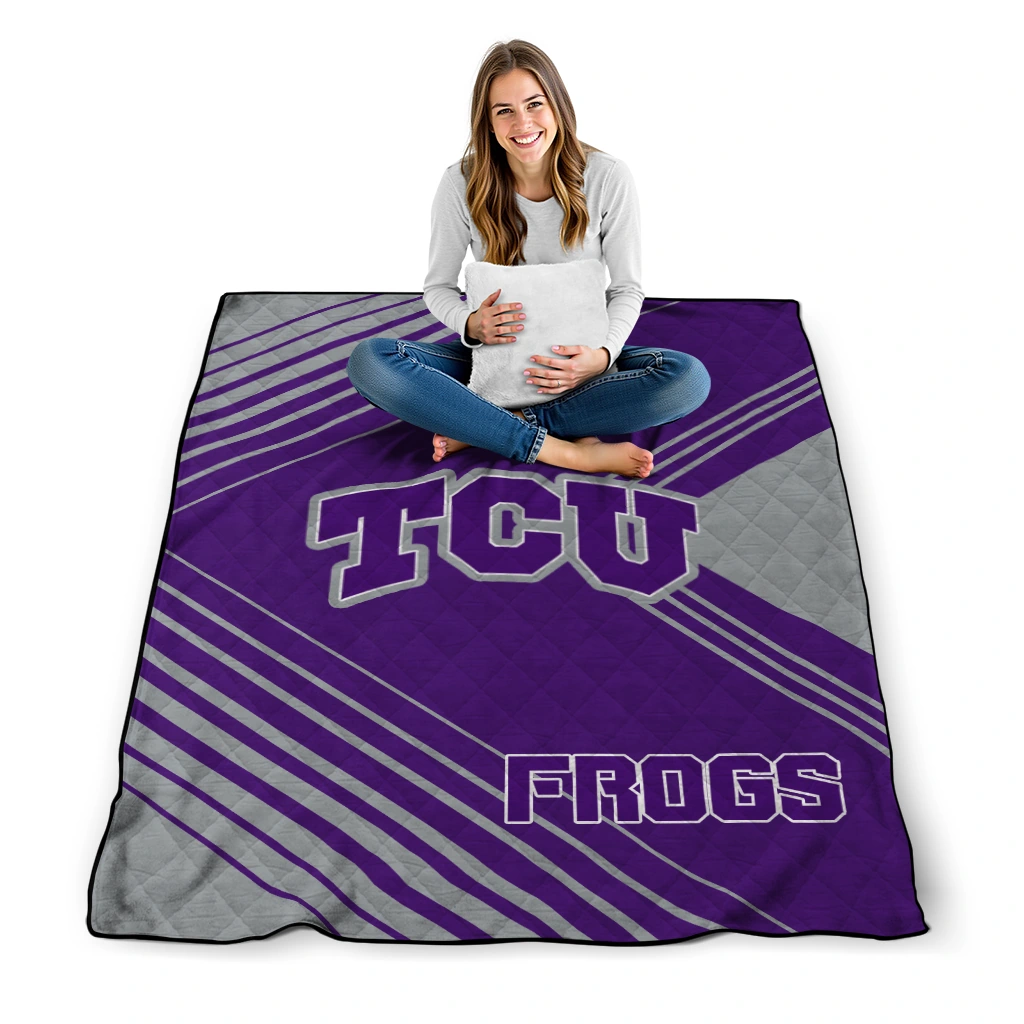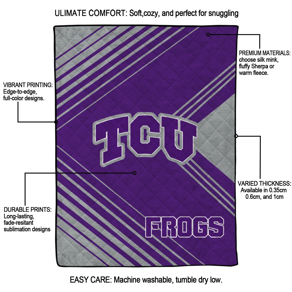 Wrap yourself in warmth and pride with the TCU Horned Frogs Arrow Layers Purple Quilt Blanket from the TCU Horned Frogs Blankets collection at Yes That Blanket. Made from 100% premium quilting-weight polyester blended with a touch of microfiber, this quilt offers a smooth, soft finish you’ll love. Choose between two quilting styles—Stipple or Diagonal—and enjoy the comfort of a cotton-filled layer inside that adds extra coziness for every season. The border is available in classic black or white, giving your design a clean, timeless edge.
