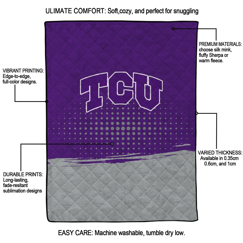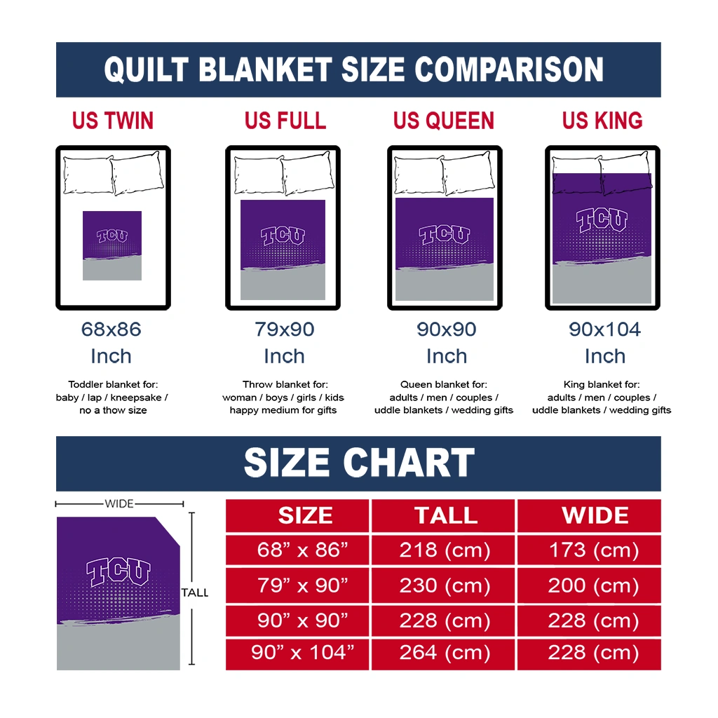 Wrap yourself in warmth and pride with the TCU Horned Frogs Dot Illusion Purple Quilt Blanket from the TCU Horned Frogs Blankets collection at Yes That Blanket. Made from 100% premium quilting-weight polyester blended with a touch of microfiber, this quilt offers a smooth, soft finish you’ll love. Choose between two quilting styles—Stipple or Diagonal—and enjoy the comfort of a cotton-filled layer inside that adds extra coziness for every season. The border is available in classic black or white, giving your design a clean, timeless edge.