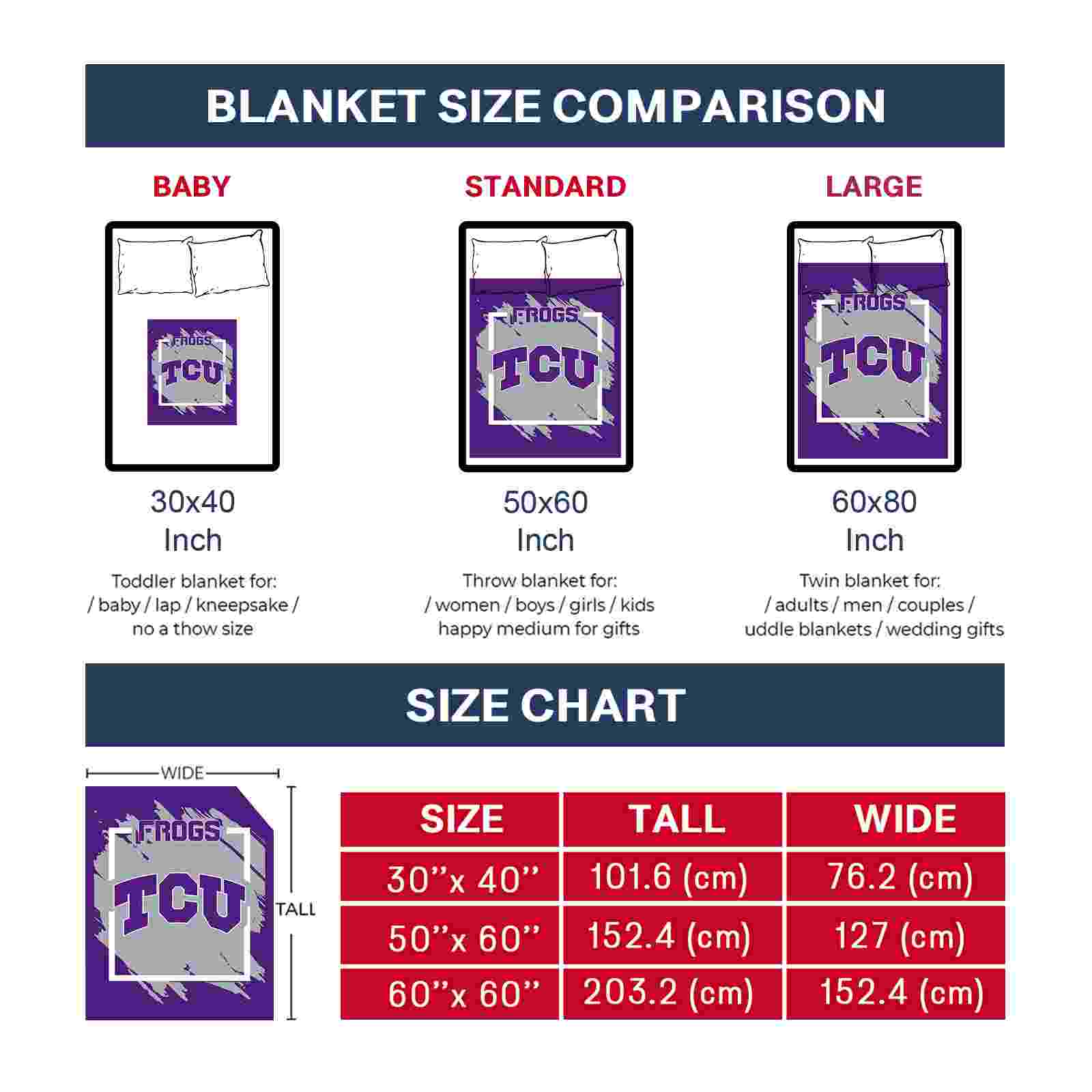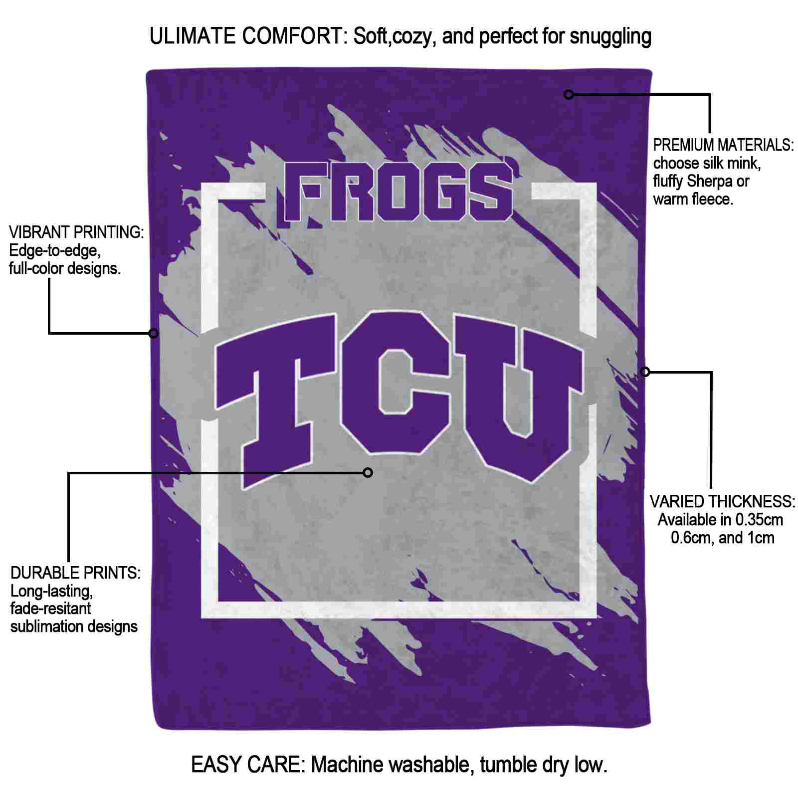 Without a doubt, the TCU Horned Frogs Splatter Effect Purple Blanket from TCU Horned Frogs Blankets collection is offering true fans a chance to showcase passion in a cool way. Personalize it with your favorite team’s logo or a meaningful name to make it uniquely yours. Isn’t that great? The full-color print ensures vibrant, edge-to-edge designs, bringing your sports enthusiasm to life!