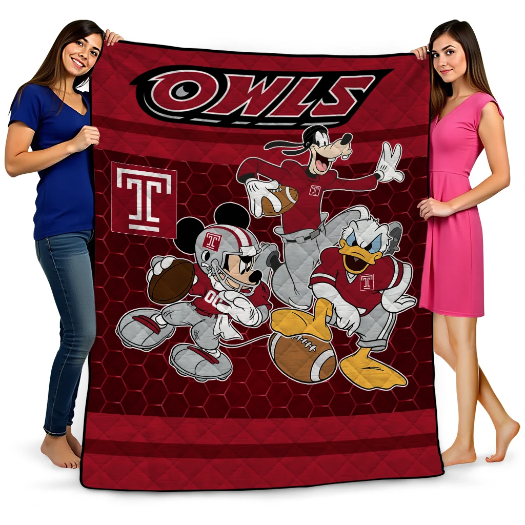 Wrap yourself in warmth and pride with the Temple Owls Disney Football Red Quilt Blanket from the Temple Owls Blankets collection at Yes That Blanket. Made from 100% premium quilting-weight polyester blended with a touch of microfiber, this quilt offers a smooth, soft finish you’ll love. Choose between two quilting styles—Stipple or Diagonal—and enjoy the comfort of a cotton-filled layer inside that adds extra coziness for every season. The border is available in classic black or white, giving your design a clean, timeless edge.