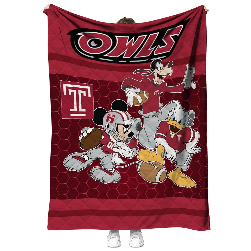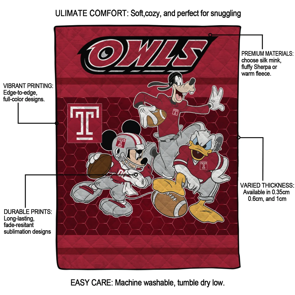 The Temple Owls Disney Football Red Quilt Blanket is more than a blanket—it’s everyday comfort, thoughtfully made. Crafted from premium quilting fabric with a soft microfiber touch, it offers a smooth hand-feel and lasting coziness. Layered quilting with a cotton-filled core provides adaptable warmth across seasons while maintaining a clean, tailored look on your bed or sofa.
