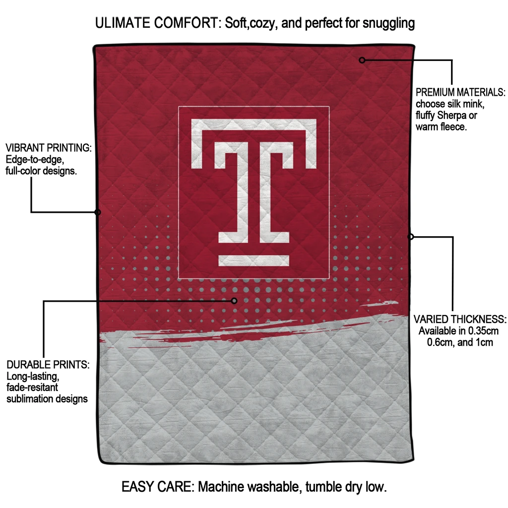 Wrap yourself in warmth and pride with the Temple Owls Dot Illusion Red Quilt Blanket from the Temple Owls Blankets collection at Yes That Blanket. Made from 100% premium quilting-weight polyester blended with a touch of microfiber, this quilt offers a smooth, soft finish you’ll love. Choose between two quilting styles—Stipple or Diagonal—and enjoy the comfort of a cotton-filled layer inside that adds extra coziness for every season. The border is available in classic black or white, giving your design a clean, timeless edge.
