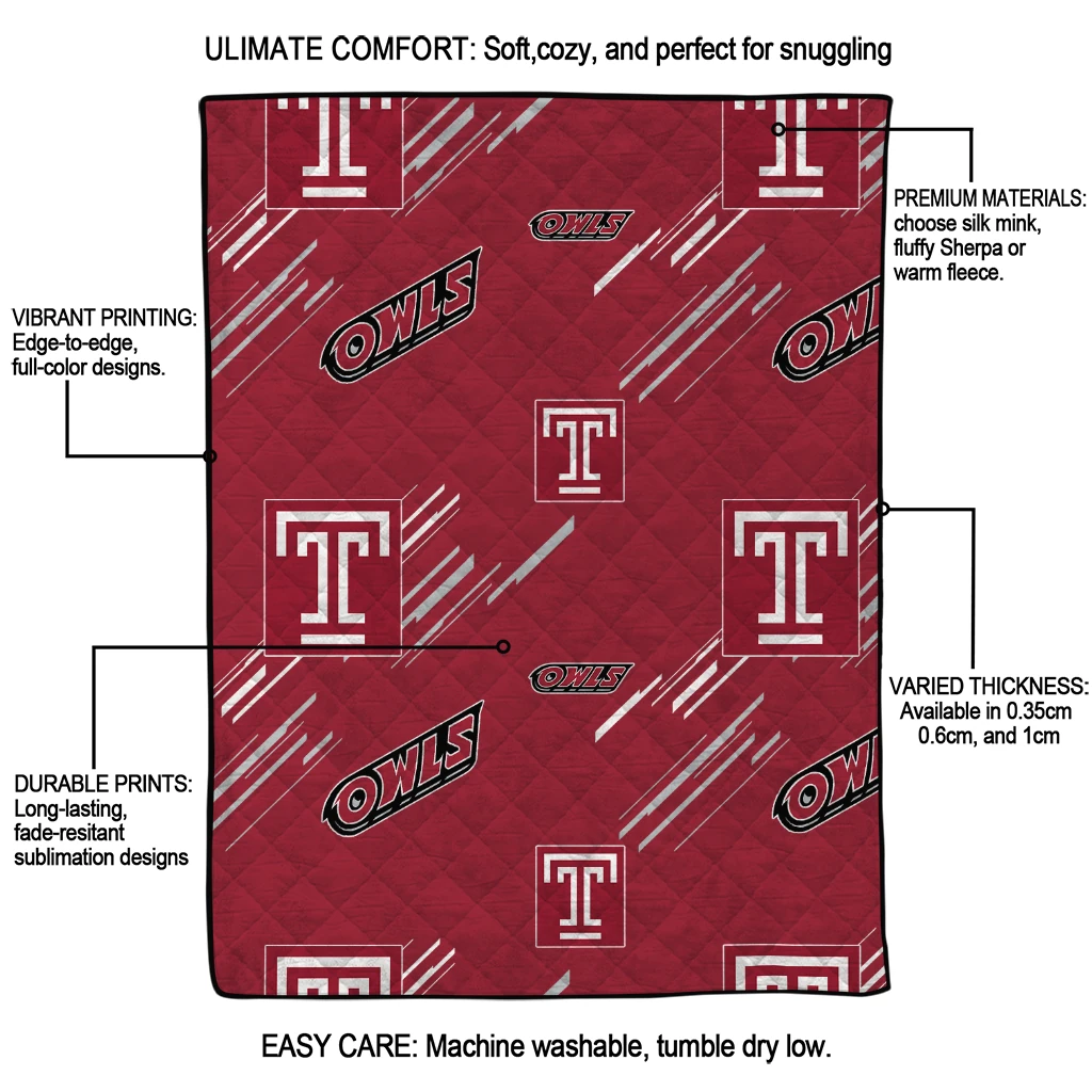 The Temple Owls Sketch Lines Red Quilt Blanket is more than a blanket—it’s everyday comfort, thoughtfully made. Crafted from premium quilting fabric with a soft microfiber touch, it offers a smooth hand-feel and lasting coziness. Layered quilting with a cotton-filled core provides adaptable warmth across seasons while maintaining a clean, tailored look on your bed or sofa.