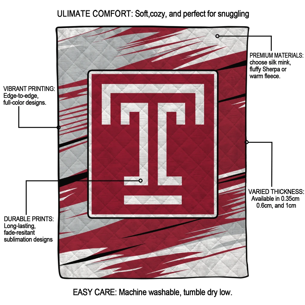 Wrap yourself in warmth and pride with the Temple Owls Wild Lines Red White Quilt Blanket from the Temple Owls Blankets collection at Yes That Blanket. Made from 100% premium quilting-weight polyester blended with a touch of microfiber, this quilt offers a smooth, soft finish you’ll love. Choose between two quilting styles—Stipple or Diagonal—and enjoy the comfort of a cotton-filled layer inside that adds extra coziness for every season. The border is available in classic black or white, giving your design a clean, timeless edge.