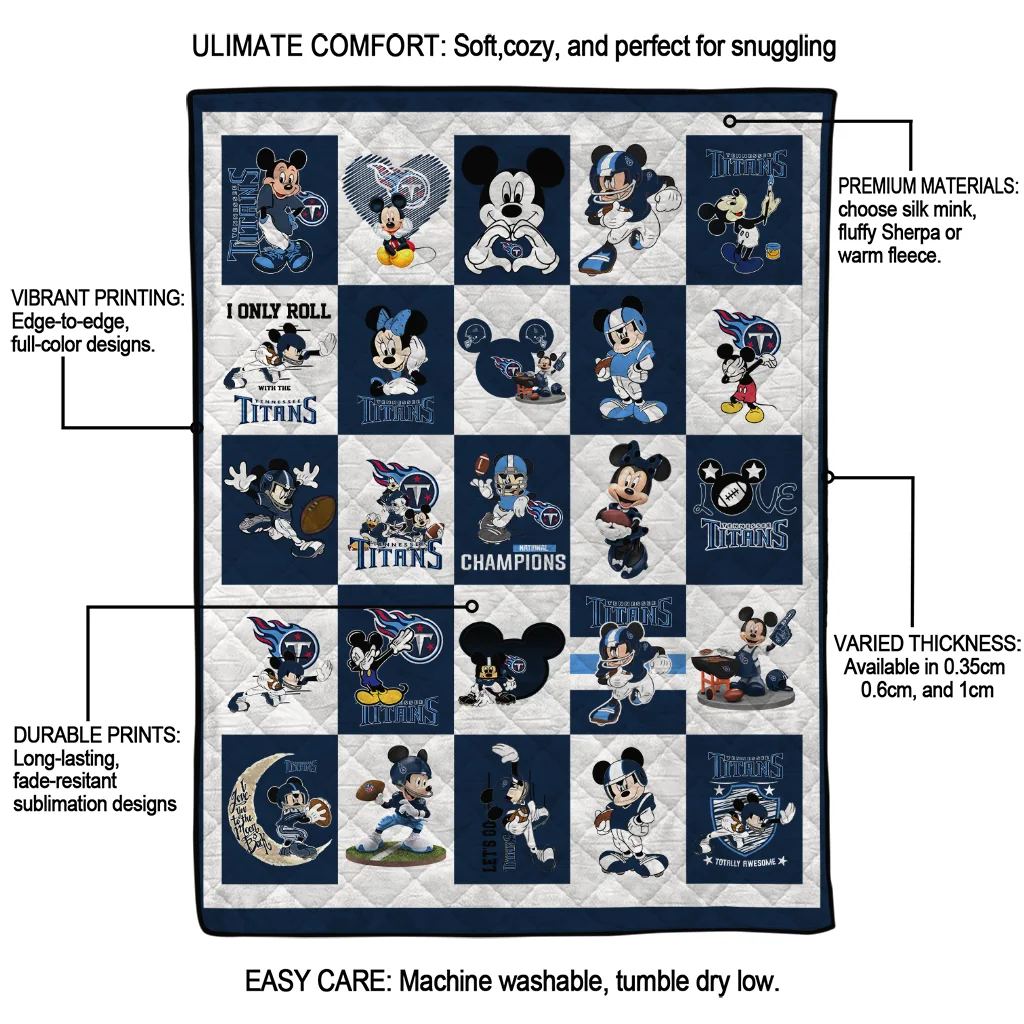 The Tennessee Titans Mickey Pattern Navy White Quilt Blanket is more than a blanket—it’s everyday comfort, thoughtfully made. Crafted from premium quilting fabric with a soft microfiber touch, it offers a smooth hand-feel and lasting coziness. Layered quilting with a cotton-filled core provides adaptable warmth across seasons while maintaining a clean, tailored look on your bed or sofa.