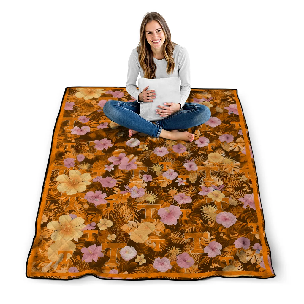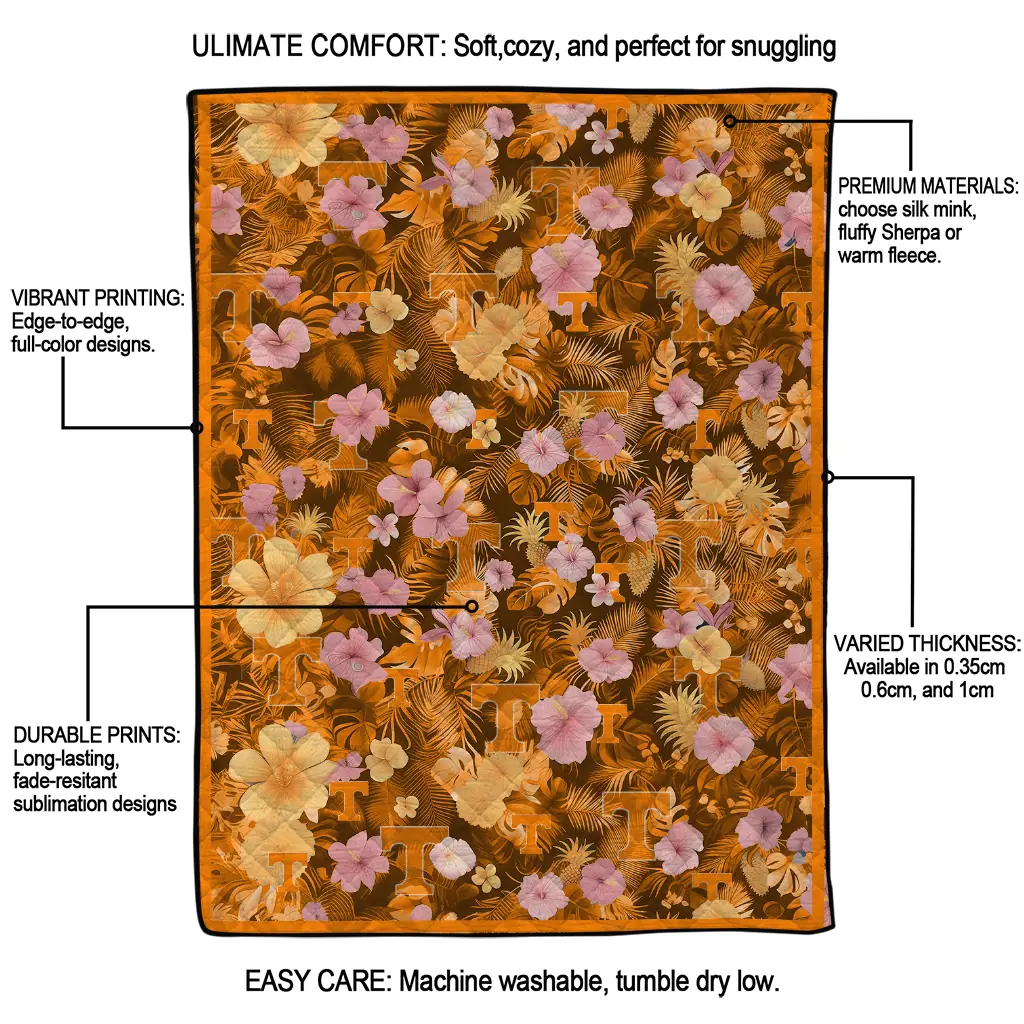 Wrap yourself in warmth and pride with the Tennessee Volunteers Hibiscus Foliage Orange Quilt Blanket from the Tennessee Volunteers Blankets collection at Yes That Blanket. Made from 100% premium quilting-weight polyester blended with a touch of microfiber, this quilt offers a smooth, soft finish you’ll love. Choose between two quilting styles—Stipple or Diagonal—and enjoy the comfort of a cotton-filled layer inside that adds extra coziness for every season. The border is available in classic black or white, giving your design a clean, timeless edge.