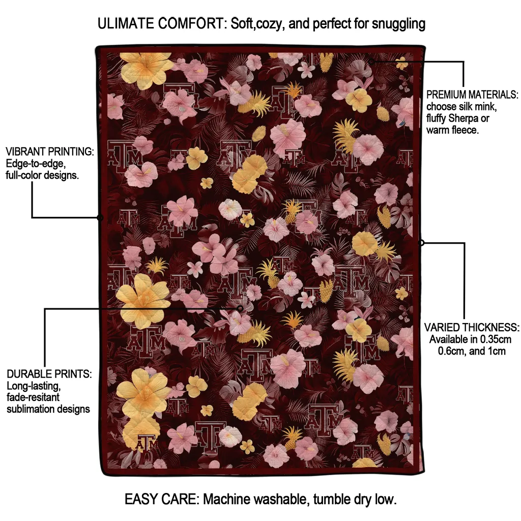 Wrap yourself in warmth and pride with the Texas A&M Aggies Hibiscus Foliage Maroon Quilt Blanket from the Texas A&M Aggies Blankets collection at Yes That Blanket. Made from 100% premium quilting-weight polyester blended with a touch of microfiber, this quilt offers a smooth, soft finish you’ll love. Choose between two quilting styles—Stipple or Diagonal—and enjoy the comfort of a cotton-filled layer inside that adds extra coziness for every season. The border is available in classic black or white, giving your design a clean, timeless edge.