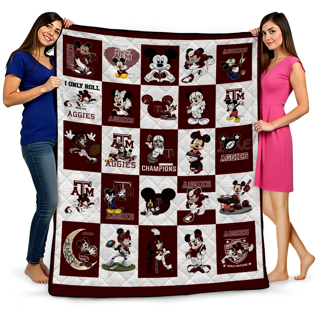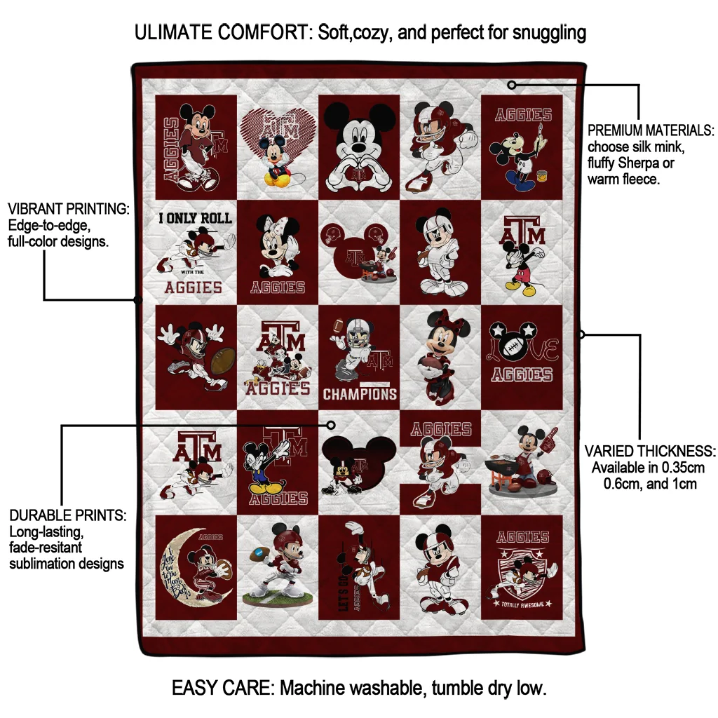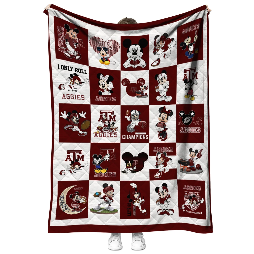 Wrap yourself in warmth and pride with the Texas A&M Aggies Mickey Mouse Motif Maroon White Quilt Blanket from the Texas A&M Aggies Blankets collection at Yes That Blanket. Made from 100% premium quilting-weight polyester blended with a touch of microfiber, this quilt offers a smooth, soft finish you’ll love. Choose between two quilting styles—Stipple or Diagonal—and enjoy the comfort of a cotton-filled layer inside that adds extra coziness for every season. The border is available in classic black or white, giving your design a clean, timeless edge.