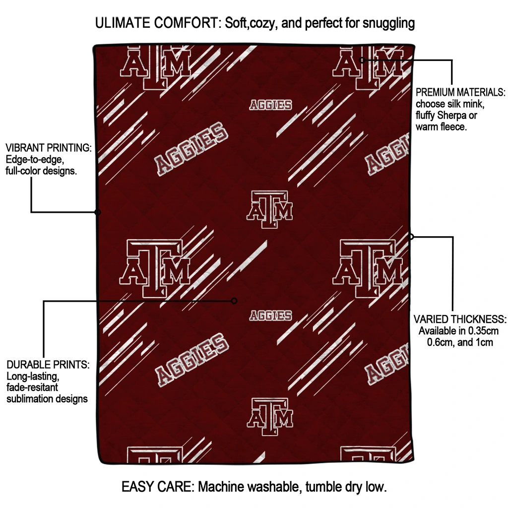 Wrap yourself in warmth and pride with the Texas A&M Aggies Sketch Lines Maroon Quilt Blanket from the Texas A&M Aggies Blankets collection at Yes That Blanket. Made from 100% premium quilting-weight polyester blended with a touch of microfiber, this quilt offers a smooth, soft finish you’ll love. Choose between two quilting styles—Stipple or Diagonal—and enjoy the comfort of a cotton-filled layer inside that adds extra coziness for every season. The border is available in classic black or white, giving your design a clean, timeless edge.
