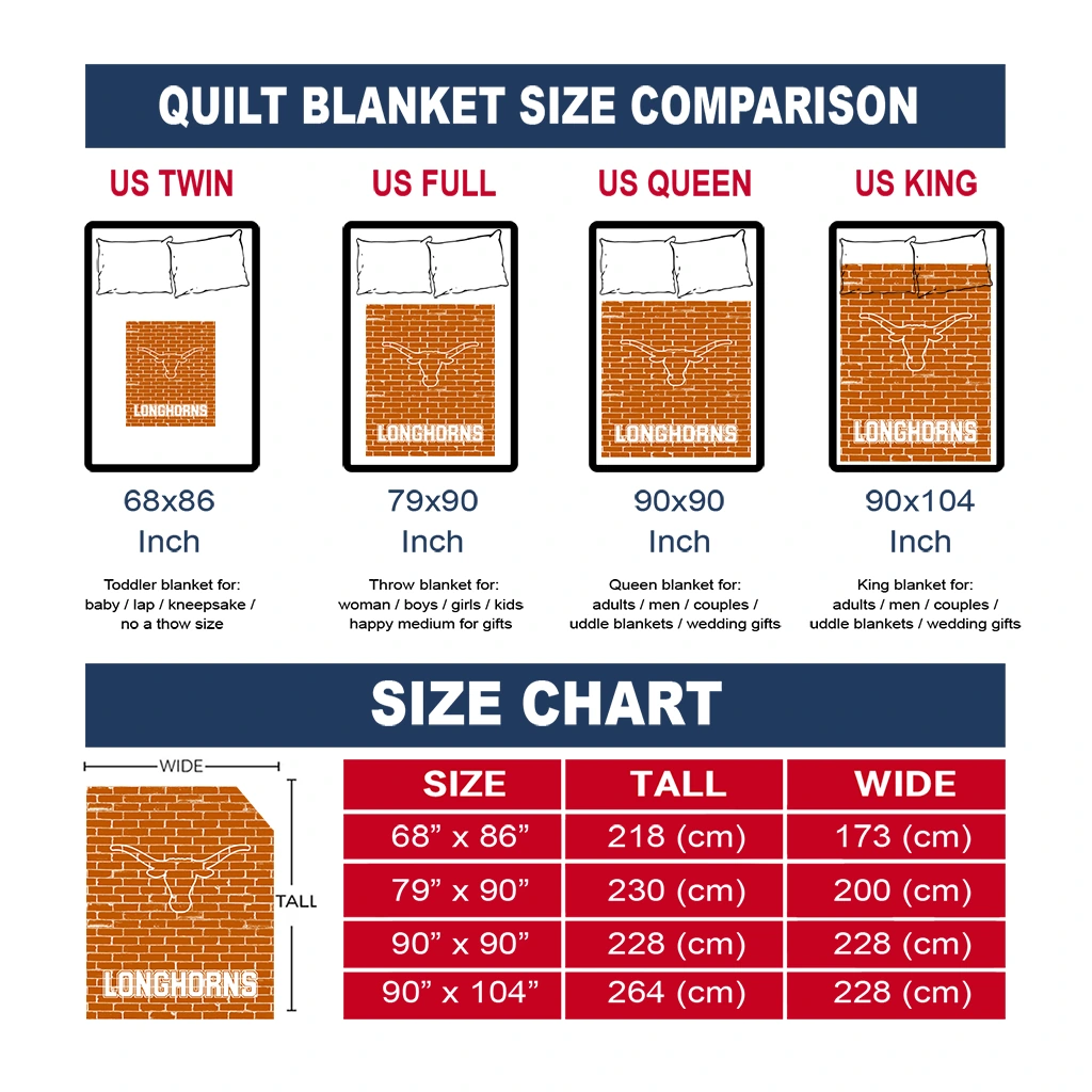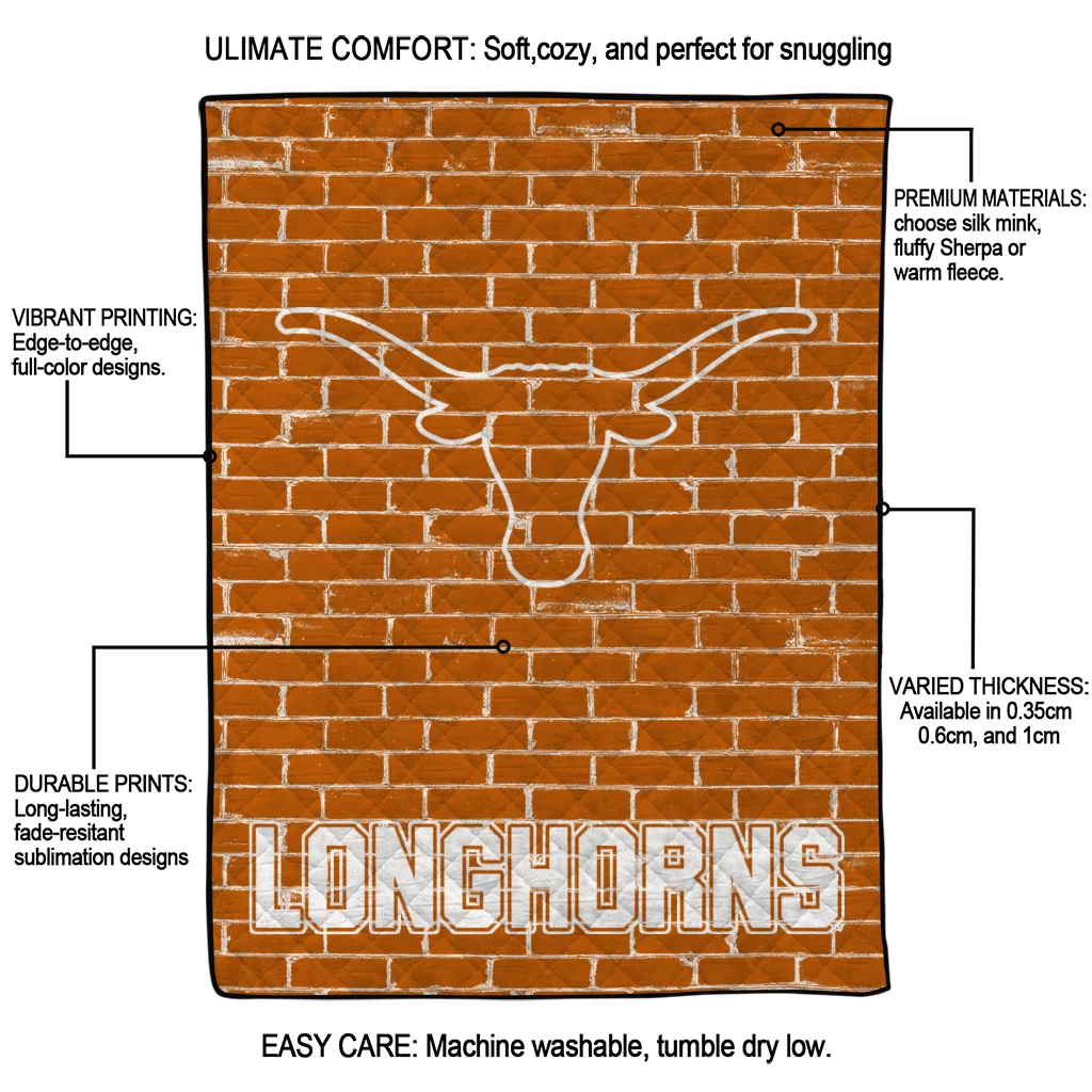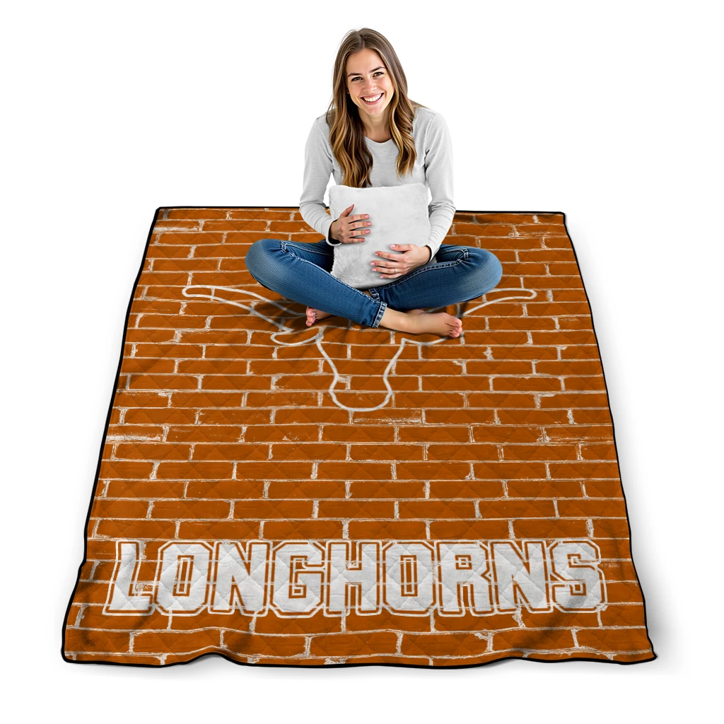 Wrap yourself in warmth and pride with the Texas Longhorns Brick Grid Orange Quilt Blanket from the Texas Longhorns Blankets collection at Yes That Blanket. Made from 100% premium quilting-weight polyester blended with a touch of microfiber, this quilt offers a smooth, soft finish you’ll love. Choose between two quilting styles—Stipple or Diagonal—and enjoy the comfort of a cotton-filled layer inside that adds extra coziness for every season. The border is available in classic black or white, giving your design a clean, timeless edge.