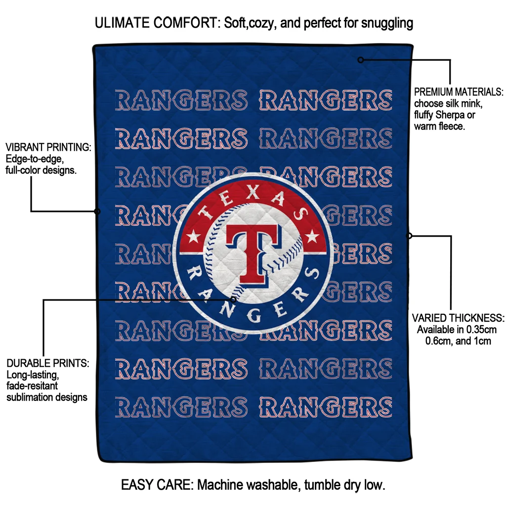 The Texas Rangers Bold Red Blue Quilt Blanket is more than a blanket—it’s everyday comfort, thoughtfully made. Crafted from premium quilting fabric with a soft microfiber touch, it offers a smooth hand-feel and lasting coziness. Layered quilting with a cotton-filled core provides adaptable warmth across seasons while maintaining a clean, tailored look on your bed or sofa.