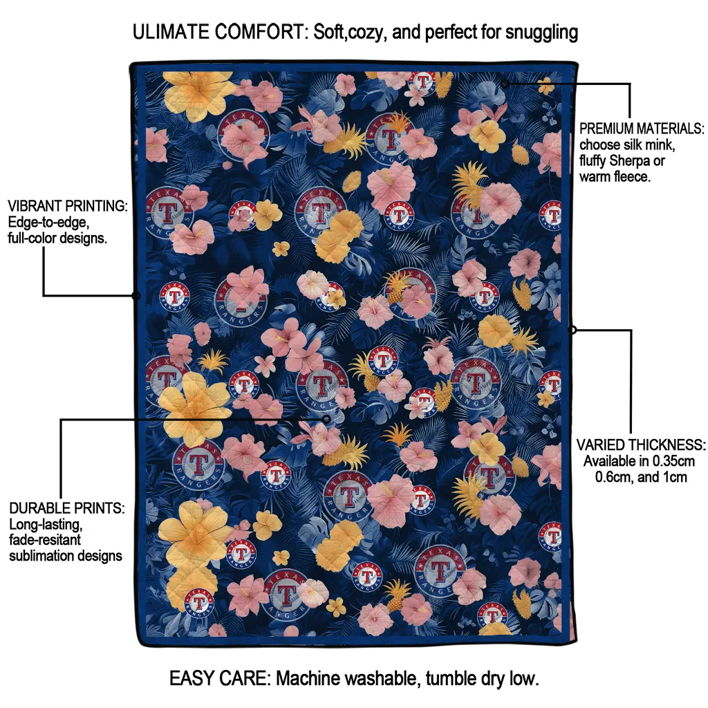 Wrap yourself in warmth and pride with the Texas Rangers Hibiscus Foliage Blue Quilt Blanket from the Texas Rangers Blankets collection at Yes That Blanket. Made from 100% premium quilting-weight polyester blended with a touch of microfiber, this quilt offers a smooth, soft finish you’ll love. Choose between two quilting styles—Stipple or Diagonal—and enjoy the comfort of a cotton-filled layer inside that adds extra coziness for every season. The border is available in classic black or white, giving your design a clean, timeless edge.