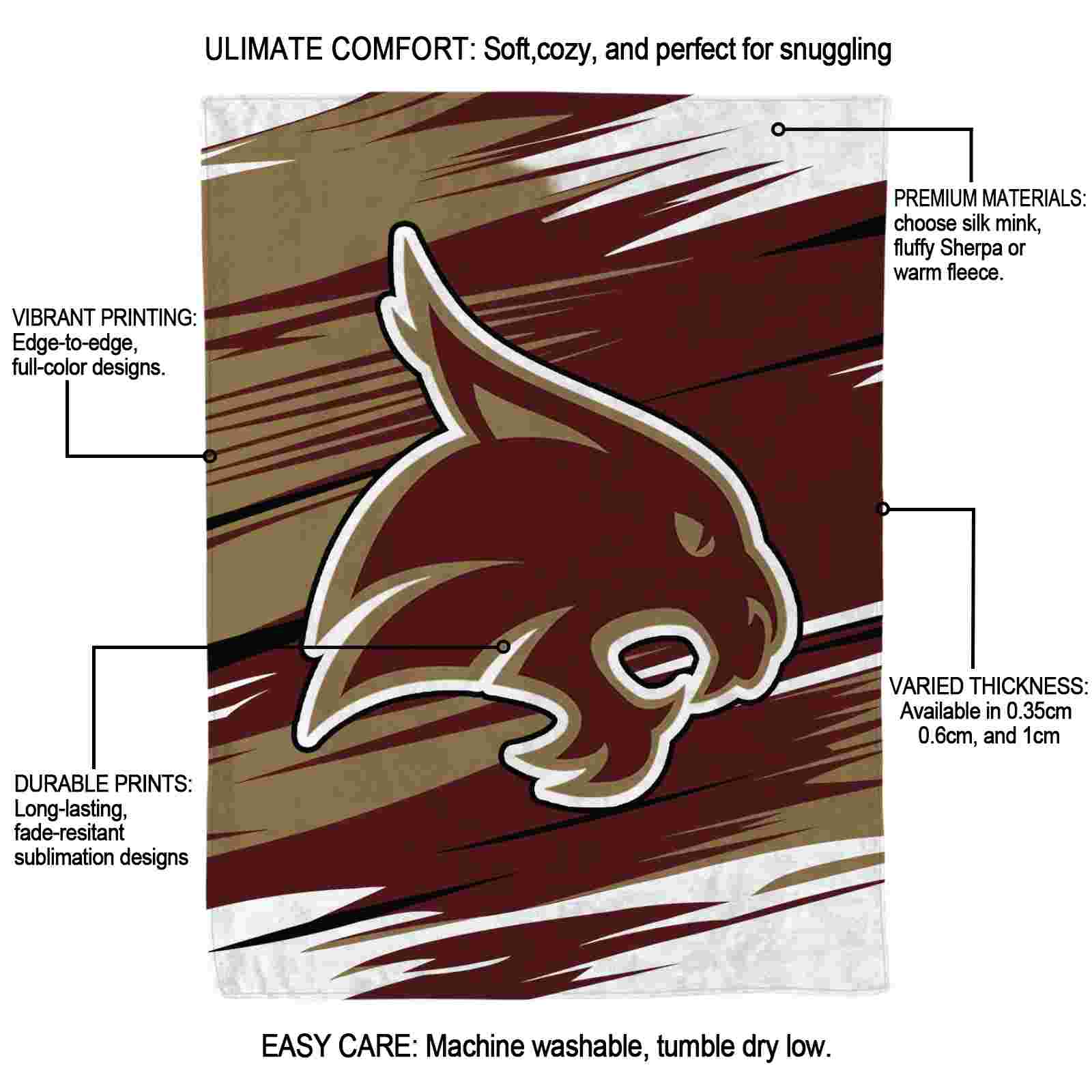 Without a doubt, the Texas State Bobcats Paint Streaks Maroon White Blanket from Texas State Bobcats Blankets collection is offering true fans a chance to showcase passion in a cool way. Personalize it with your favorite team's logo or a meaningful name to make it uniquely yours. Isn't that great? The full-color print ensures vibrant, edge-to-edge designs, bringing your sports enthusiasm to life!